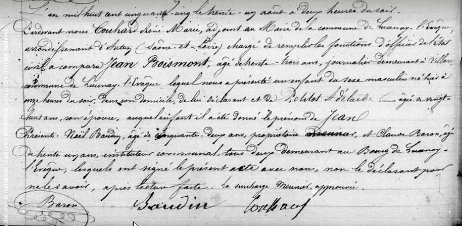 | Prénom | Jean | | Nom de famille | Boismont | | Profession | Journalier | L'an mil huit cent cinquante-un le trentre-un âout à deux heures du soir. Pardevant nous Couchard René maire adjoint au maire de la commune de Lucenay l'Evêque, arrondissement d'Autun (Saône et Loire) chargé de remplir les fonctions d'officier de l'état civil a comparu Jean Boismont âgé de trente-trois ans journalier demeurant à Villars commune de Lucenay l'Evêque lequel nous a présenté un enfant du sexe masculin né hier à onze heures du soir dans son domicile de lui déclarant et de Petitot Adélaide agée de vingt huit ans son épouse auquel enfant il a été donné le prénom de Jean. Presents: Noël Baudin âgé de cinquante deux ans propriétaire meunier et Claude Baron âgé de trente six ans instituteur communal tous deux demeurant au bourg de Lucenay l'Evêque. lesquels ont signé le présent acte avec nous, non le déclarant pour ne le savoir, après lecture faite | Naissance (plus...) | 30 août 1855 | Lucenay-l'Évêque, Saône-et-Loire, FRANCE (Villars, Lucenay-l'Évêque, 71266, Saône et Loire, Bourgogne-Franche-Comté, France) | Témoins au Bapteme/Naissance | Père Jean Boismont 40 (1825 - 1938) Témoin Noël Baudin (1800) Témoin Claude Baron (1829)