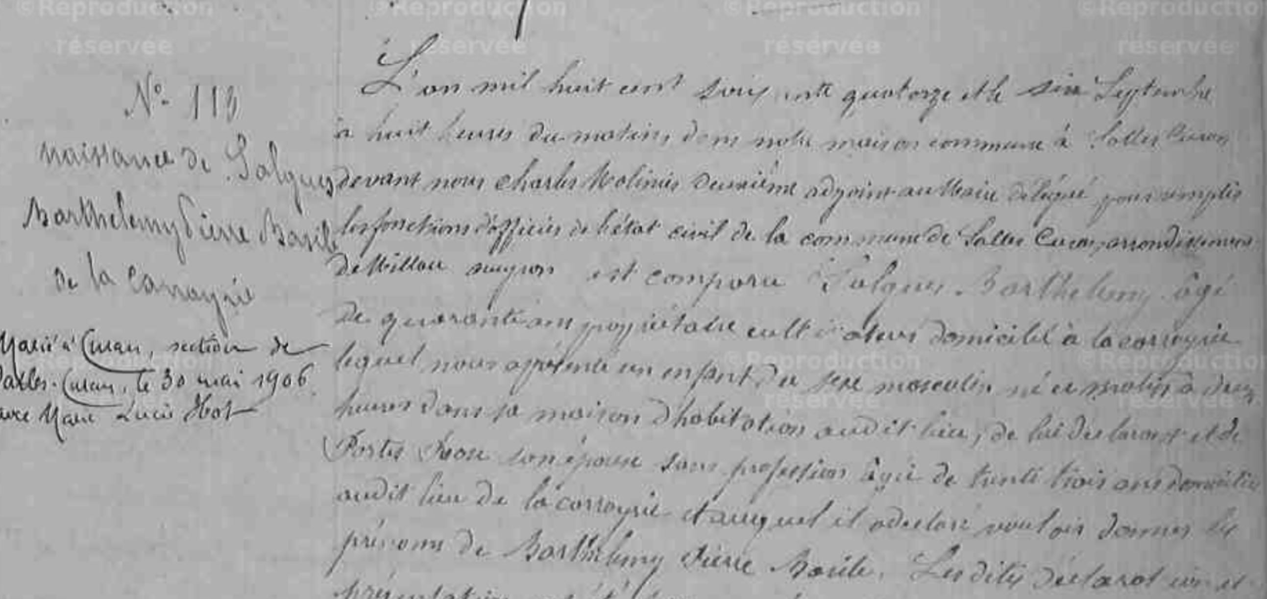 Indication du mariage en marge de l'acte de naissance de Barthelemy Pierre Basile