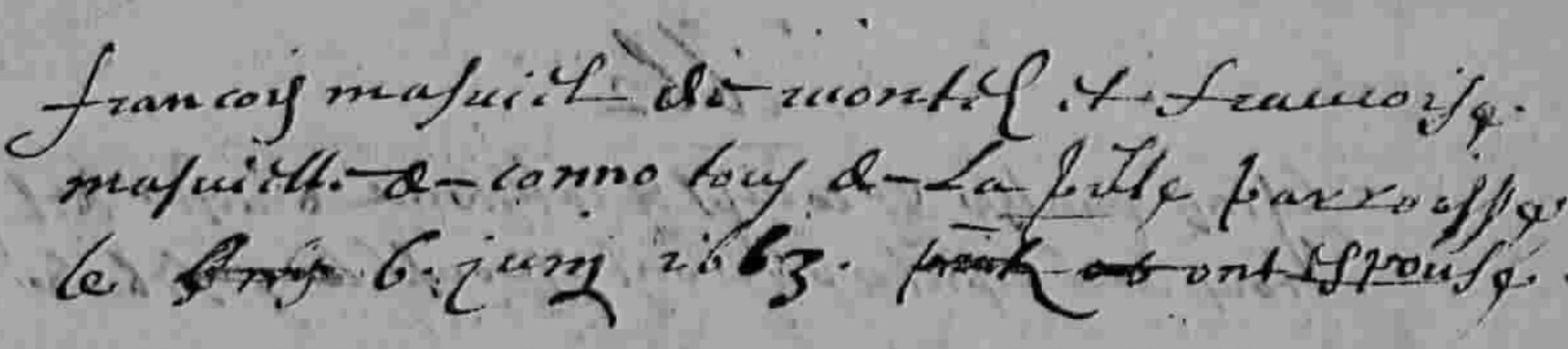 François Maviel de Montil et Françoise Mavielle de c... tous de la ... paroisse le 6 juin 1663 .. ... ot epousé