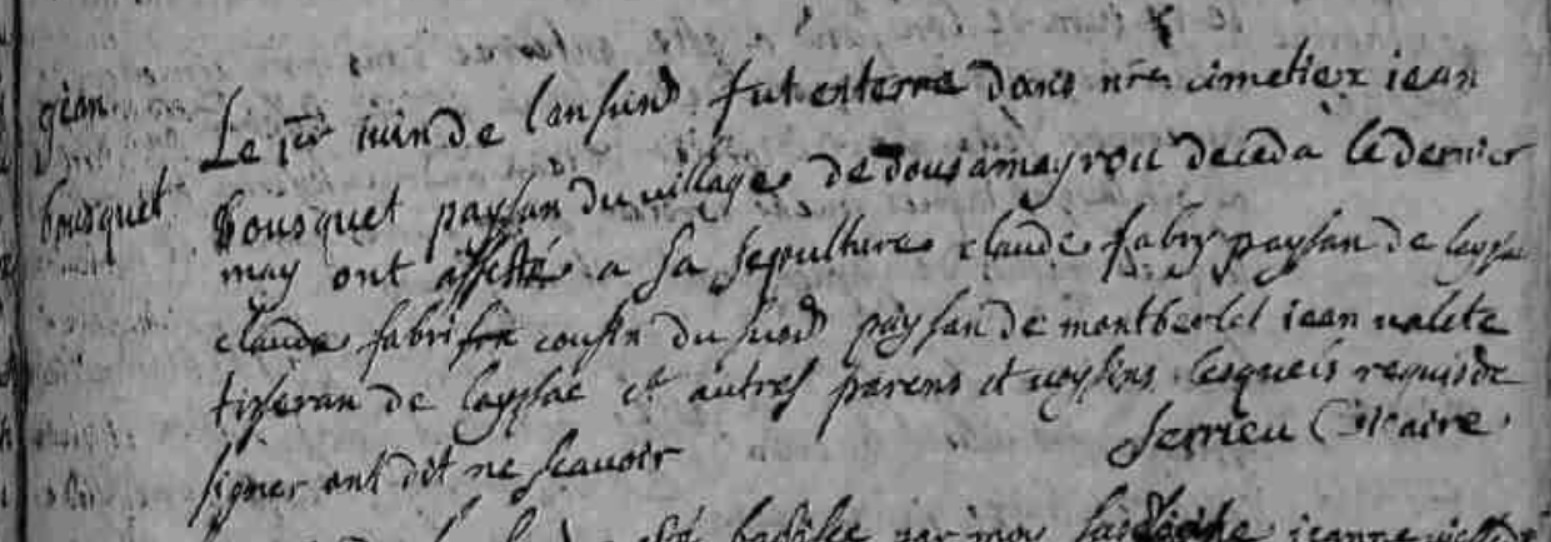 | Prénom | Jean | | Nom de famille | Bousquet | | Naissance | ? | Laissac, Aveyron, FRANCE (Montmerlhe, Laissac, 12120, Aveyron, Occitanie, France) | Le 1er juin de l'an... fut enterré dans notre cimetiere Jean Bousquet paysan du village de Douzoumayroux decedé le dernier may ont assisté à sa sepulture Claude Fab... paysans de Layssac Claude Fabri cousin du ... paysans de Montherbel et Jean Valete tisseran de Layssac et autres parens et ... lesquels requis de signer ont dit ne seavoir | Décès (plus...) | 31 mai 1692 | Laissac, Aveyron, FRANCE (Douzoumayroux, Laissac, 12120, Aveyron, Occitanie, France) | | Sépulture | 1 juin 1692 | Laissac, Aveyron, FRANCE (, Laissac, 12120, Aveyron, Occitanie, France) |
