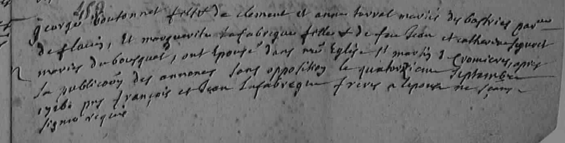 George Boutonnet fils de Clément et Anne Terral mariés des Bastries paroisse de Flavin, et Marguerite Lafabregue fille de feu Jean et Catherine Seguret mariés du Bousquet, ont épousé dans .. église St Martin de Cormières après la publication des annonces sans opposition le quatorzieme septembre 1716 presents François et Jean Lafabregue frère à l'épouse ne sachant signer requis