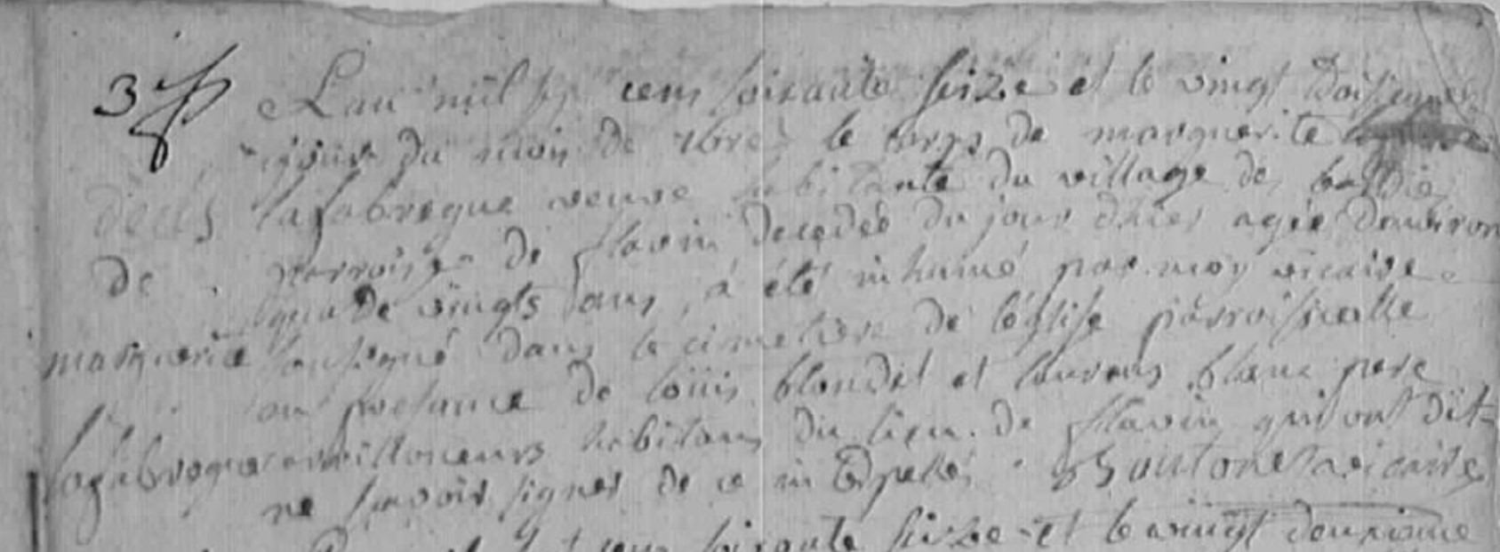 | Prénom | Marguerite | | Nom de famille | Lafabregue | Le 2 avril 1695 fut baptisée Marguerite LAFABREGUE née le 1er fille de Jean paysan et Catherine Seguret mariés du Bousquet. Parrain François Lafabregue dudit village, marraine Marguerite Clusel del Portal ne sachant signer | Naissance (plus...) | 1 avril 1695 | Vibal (Le), Aveyron, FRANCE (Le Bousquet, Le Vibal, 12297, Aveyron, Occitanie, France) | | Baptême | 2 avril 1695 | Vibal (Le), Aveyron, FRANCE (, Le Vibal, 12297, Aveyron, Occitanie, France) | | Décès | 22 septembre 1776 à l'âge de 81 ans | Flavin, Aveyron, FRANCE (, Flavin, 12102, Aveyron, Occitanie, France) | | Sépulture | 22 septembre 1776 | Flavin, Aveyron, FRANCE (, Flavin, 12102, Aveyron, Occitanie, France) |