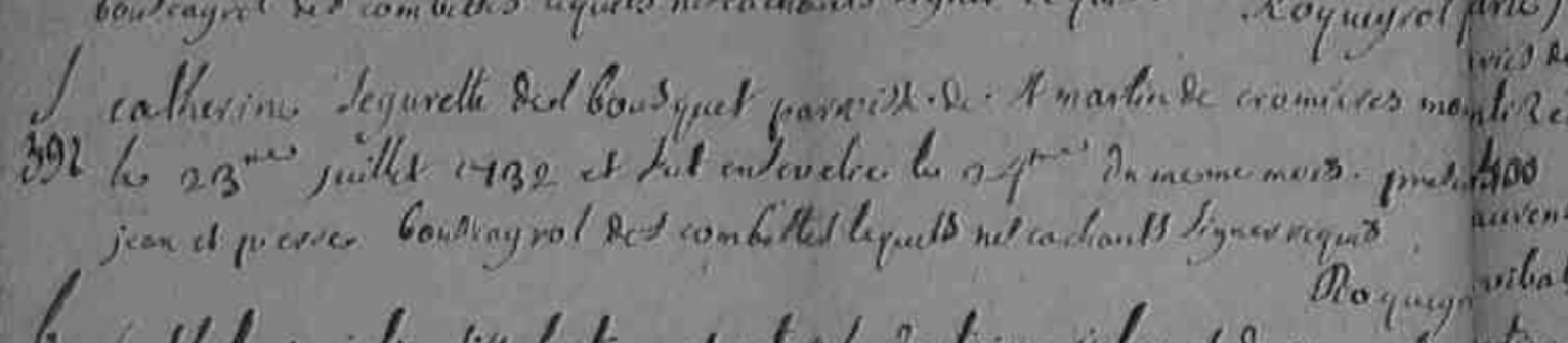 | Prénom | Catherine | | Nom de famille | Seguret | Catherine Segurette du Bousquet paroisse de Saint Martin de Cormières mou... le 23e juillet 1732 et fut ensevelie le 24e du même mois présent Jean et Pierre Boutayrol des Combettes lequels ne sachant signer | Décès (plus...) | 23 juillet 1732 | Vibal (Le), Aveyron, FRANCE (Le Bousquet Saint Martin de Cormières, Le Vibal, 12297, Aveyron, Occitanie, France) | Témoins Décès | Témoin Jean Boutayrol Témoin Pierre Boutayril