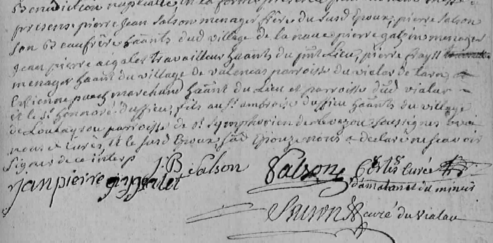 | Prénom | Jean Baptiste | | Nom de famille | Salson | | Naissance | 26 février 1758 | Viala-du-Tarn, Aveyron, FRANCE (Le Minier Le Nauc, Viala-du-Tarn, 12296, Aveyron, Occitanie, France) | | Baptême | 26 février 1758 | Viala-du-Tarn, Aveyron, FRANCE (, Viala-du-Tarn, 12296, Aveyron, Occitanie, France) |