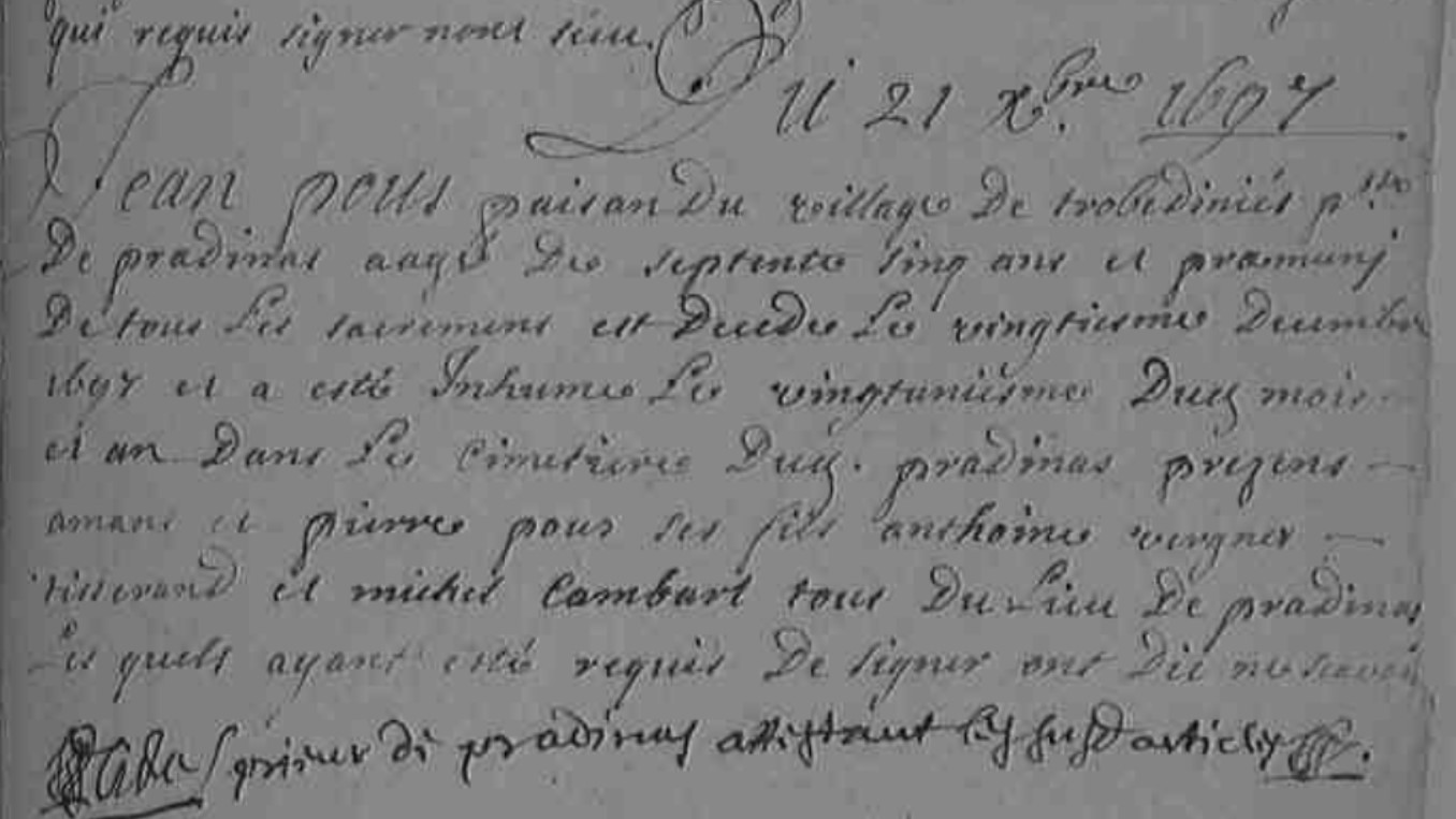 | Prénom | Jean | | Nom de famille | Poux | Jean Pous paisan du village de Trobedeniés parroisse de Pradinas âgé de septente cinq ans et ...muni de tous les sacremens est decédé le vingtieme décembre 1697 et a été inhumé le vingtunieme dud mois et an dans le cimetiere dud Pradinas présens Amans et Pierre Pous ses fils Anthoine Vergnes tisserand et Michel Combart tous du lieu de Pradinas les quels ayant été requis de signer ont dit ne savoir | Décès (plus...) | 20 décembre 1697 | Pradinas, Aveyron, FRANCE (Trouvedeniers, Pradinas, 12189, Aveyron, Occitanie, France) | Témoins Décès | Témoin Amans Poux Témoin Pierre Poux Témoin Anthoine Vergnes Témoin Michel Combart