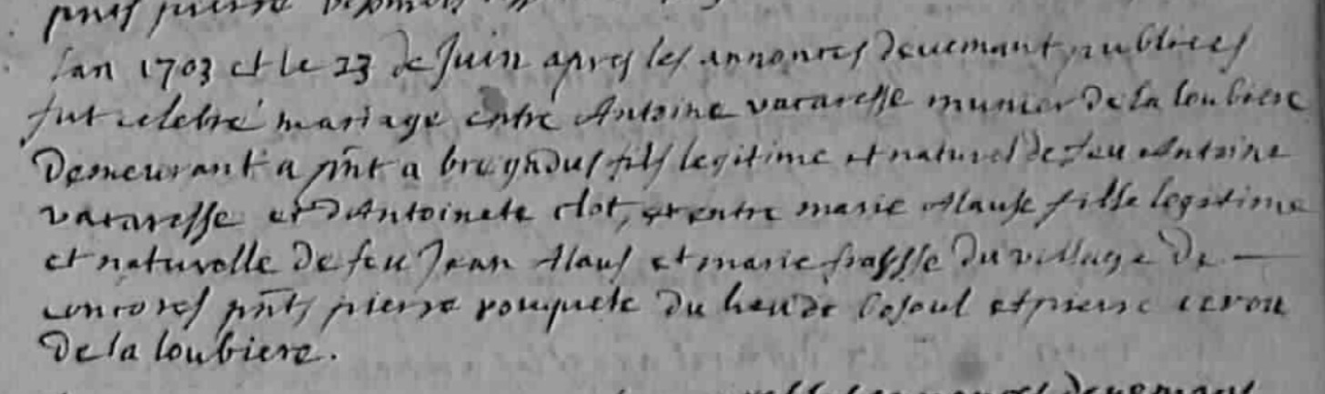 | Union | Antoine Vacaresse 1790 | l'an 1703 et le 23 juin apres les annonces duement publiées fut celebré mariage entre Antoine Vacaresse meunier de la Loubière demeurant à présent à Brugndit fils légitime et naturel de feu Antoine Vacaresse et d'Antoinette Clot, et entre Marie Alaux fille légitime et naturelle de feu Jean Alaux et Marie Fraysse du village de conros... présents Pierre Romprete du lieu de bosoul et Pierre Icrou de la Loubière Contrat de mariage du 03.05.1703 à rodez par devant Me MARION notaire AD 12 3E15046 | Mariage (plus...) | 23 juin 1703 | Montrozier, Aveyron, FRANCE (, Montrozier, 12157, Aveyron, Occitanie, France) | Enfant(s) | Marie Vacaresse 895 (13 décembre 1716 - 15 mai 1763)
