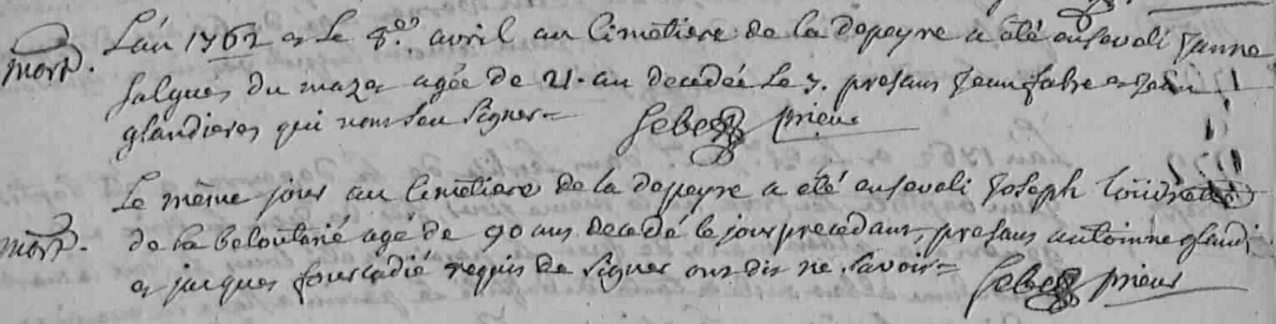 | Prénom | Joseph | | Nom de famille | Louirette | Agé de 90 ans à son décès le 8 avril 1762 | Naissance (plus...) | 1672 | | le même jour au cimetiere de la Depeyre a été enseveli Joseph Louirette de la Belnoutarie agé de 90 ans decedé le jour précédant, presans Antoine ...din et Jacques Fourcadié requis de signer ont dit ne savoir | Décès (plus...) | 7 avril 1762 à l'âge de 90 ans | Viala-du-Tarn, Aveyron, FRANCE (La Beloterie Ladepeyre, Viala-du-Tarn, 12296, Aveyron, Occitanie, France) | | Sépulture | 8 avril 1762 | Viala-du-Tarn, Aveyron, FRANCE (, Viala-du-Tarn, 12296, Aveyron, Occitanie, France) |