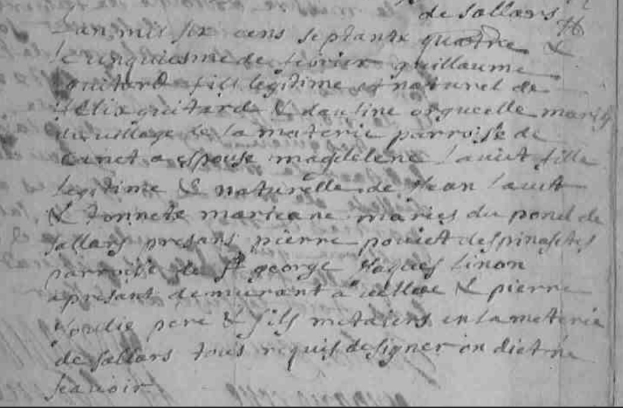 | Union | Magdeleine Lavit 1895 (11 septembre 1655) | l'an mil six cens septante quatre le cinquiesme de février Guillaume Guitard fils légitime et naturel de Félix Guitard et Dautine Orgueille mariés du village de la materie parroise de Canet a épousé Magdelaine Lavit fille légitime et naturelle de Jean Lavit et Toinette Marican mariés du Pont de Salars présens Pierre Pouiet despinasetes parroisse de St George, Jacques Linan à présans demaurant à ce..llere et Pierre Soulié pere et fils metaieres en la meterie de Sallars tous requis de signer on dit ne seavoir | Mariage (plus...) | 5 février 1674 | Pont-de-Salars, Aveyron, FRANCE (Saint Martin, Pont-de-Salars, 12185, Aveyron, Occitanie, France) | Enfant(s) | Anne Guitard 947 (? - 23 juin 1720)