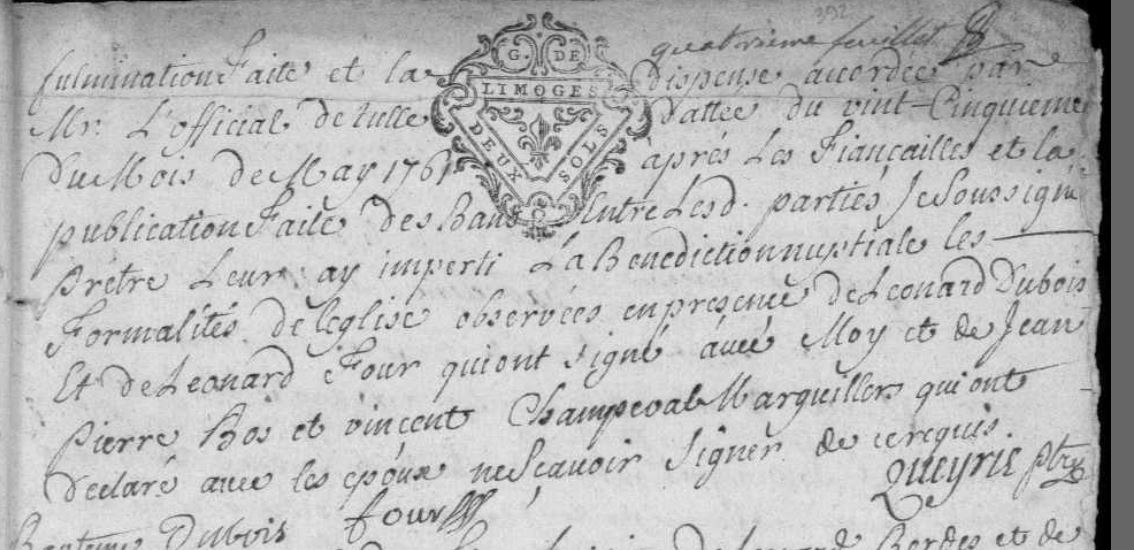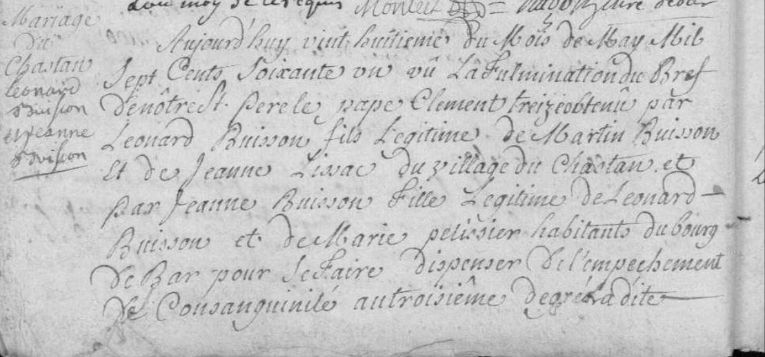 | Union | Jeanne Buisson | aujourd'huy vingt huitieme du mois de May mil sept cents soixante un vu la fulmationation du Bref de nôtre St pere le pape Clément treize obtenue par Léonard Buisson fils légitime de Martin Buisson et de Jeanne Lissac du village du Chastan et par Jeanne Buisson fille légitime de Léonard Buisson et de Marie Pelissier habitans du bourg de bar pour se faire dispenser de l'empechement de consanguinité au troisieme degré ... dite fulmination faite et la dispense accordée par Mr L'official de ... dattée du vingt cinquième du mois de may 1761 après les fiancailles et la publication faite des bans entre les d. parties je soussigne prêtre leur ay imperti la Bénediction nuptiale les formalités de l'église observés en présence de Léonard Dubois et de Léonard Four qui ont signé avec Moy et de Jean Pierre Bos et Vincent Champeval Marguillon qui ont déclaré avec les époux ne seavoir signer de ce requis (dispense de consanguinité du 3ème degré) | Mariage (plus...) | 28 mai 1761 | Corrèze, Corrèze, FRANCE (, Corrèze, 19062, Corrèze, Nouvelle-Aquitaine, France) |
