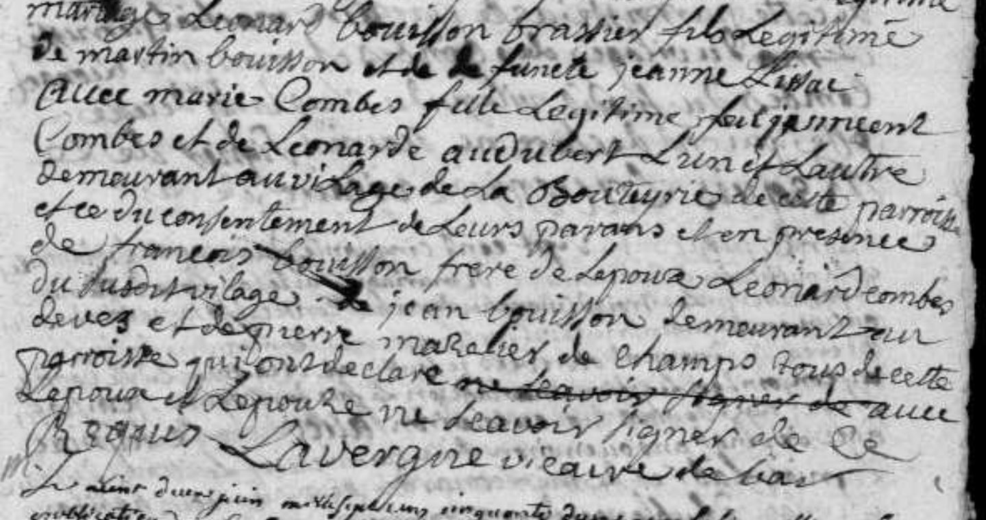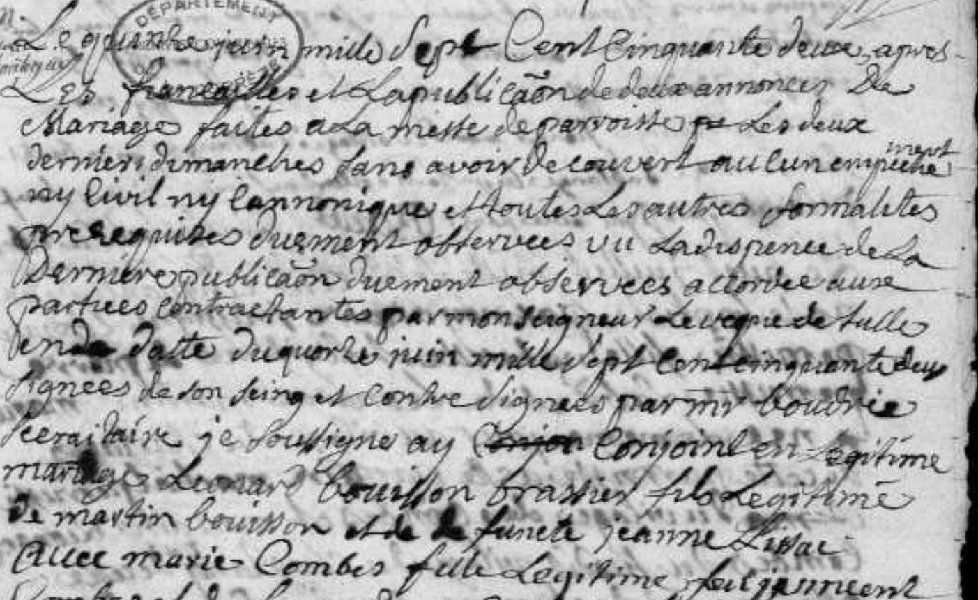 | Union | Marie Combes | le quinze juin mille sept cent cinquante deux après les fiancailles et la publication de deux annonces de mariage faites à la messe de parrisse .. les deux derniers dimanches sans avoir découvert aucun empechement ny civil ny cannonique et toutes les autres formalités prerequises duement observées vu la dispense de la derniere publication par monseigneur le ve..pre de Salle en .. datte du quatre juin mille sept cent cinquante deux signées de son seing et contre signées par Mr Boudrie .... je soussigné ay conjoint en légitime mariage Léonard Buisson brassier fils légitime de Martin Buisson et de défunte Jeanne Lissac avec Marie Combes fille légitime ... Combes et de Léonarde Audubert l'un et l'autre demeurant au village de la Bouteyrie de cette parroisse et ce du consentement de leurs parrans et en présence de François Buisson frere de l'époux , Léonard Combes deves et de ... ma..lier de champs tpus de cette parroisse qui ont déclaté avec l'époux et l'épouse ne seavoir signer de ce requis | Mariage (plus...) | 15 juin 1752 | Bar, Corrèze, FRANCE (, Bar, 19016, Corrèze, Nouvelle-Aquitaine, France) | Témoins au Mariage | Frère François Buisson 268 (? - 10 février 1787) Témoin Léonard Combes