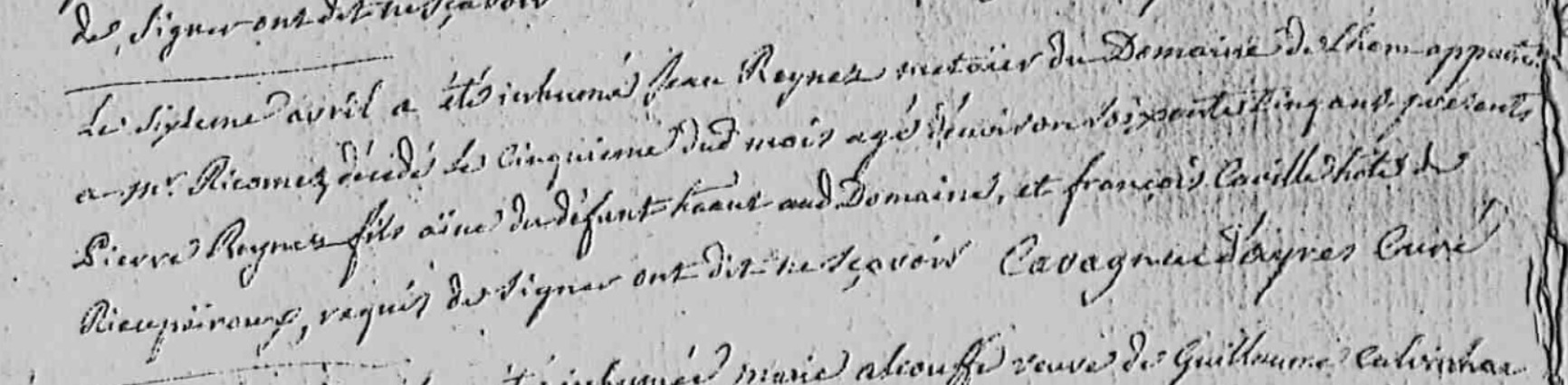 | Prénom | Jean | | Nom de famille | Reynes | | Naissance | 1699 | | le sixieme avril a été inhumé Jean Reynes métaier du domaine de Lhom appar... au... Riom... décedé le cinquieme du mois âgé d'environ soixante cinq ans présens Pierre Reynes fils ainé du défunt ... .. ... et François Caville hote de Rieupairous, requis de signer ont dit ne sçavoir | Décès (plus...) | 5 avril 1764 à l'âge de 65 ans | Rieupeyroux, Aveyron, FRANCE (, Rieupeyroux, 12198, Aveyron, Occitanie, France) | Témoins Décès | Témoin Pierre Reynes (avant 1733)
