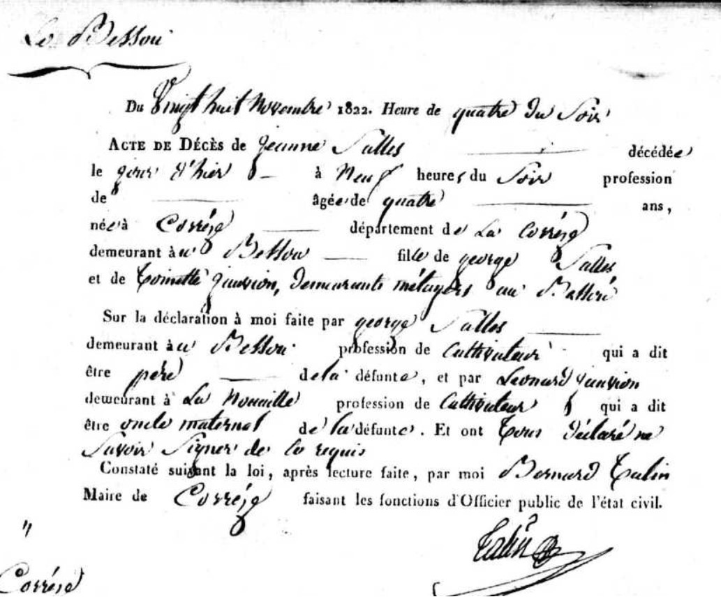 | | Décès | 27 novembre 1822 à l'âge de 4 ans | Corrèze, Corrèze, FRANCE (Le Bessou, Corrèze, 19062, Corrèze, Nouvelle-Aquitaine, France) |