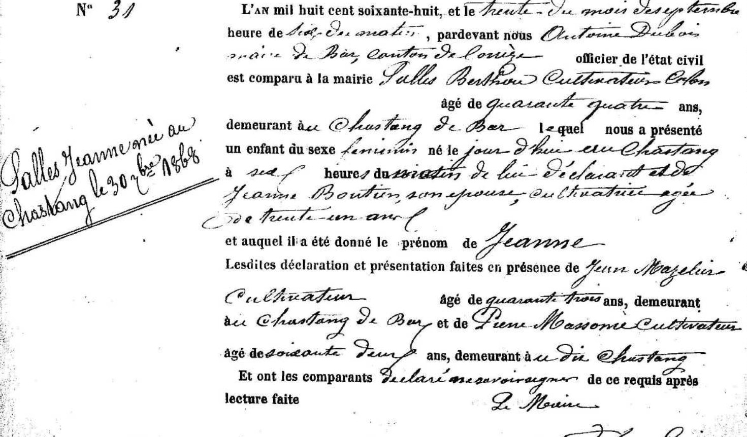 | Prénom | Jeanne Dit Juliette | | Nom de famille | Salles | | Naissance | 30 septembre 1868 | Bar, Corrèze, FRANCE (, Bar, 19016, Corrèze, Nouvelle-Aquitaine, France) | | Décès | 1928 à l'âge de 60 ans | Saint-Yrieix-le-Déjalat, Corrèze, FRANCE (, Saint-Yrieix-Le-Déjalat, 19249, Corrèze, Nouvelle-Aquitaine, France) |