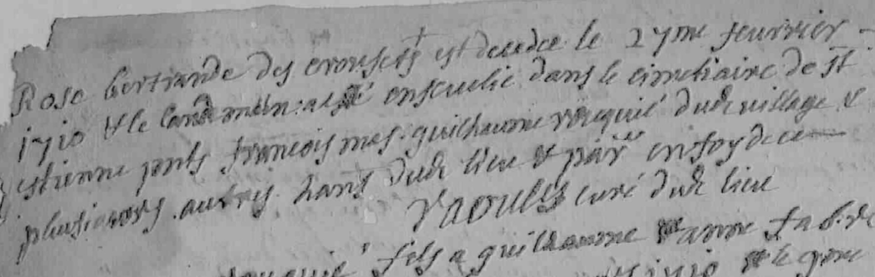 | Prénom | Rose | | Nom de famille | Bertrand | | Naissance | ? | Ségur, Aveyron, FRANCE (Les Crouzets, Saint Etienne de Viauresque, 12266, Aveyron, Occitanie, France) | Rose Bertrande des Crouzets est décédée le 27me février 1710 et le lendemain a esté ensevelie dans le cimetiere de St Etienne prnts François Mas, Guilhaume Rouquié dud village et plusieurs autres ... dud lieu et p... en foy de ce ... | Décès (plus...) | 27 octobre 1710 | Ségur, Aveyron, FRANCE (Les Crouzets, Saint Etienne de Viauresque, 12266, Aveyron, Occitanie, France) | | Sépulture | 28 octobre 1710 | Ségur, Aveyron, FRANCE (, Saint Etienne de Viauresque, 12266, Aveyron, Occitanie, France) |