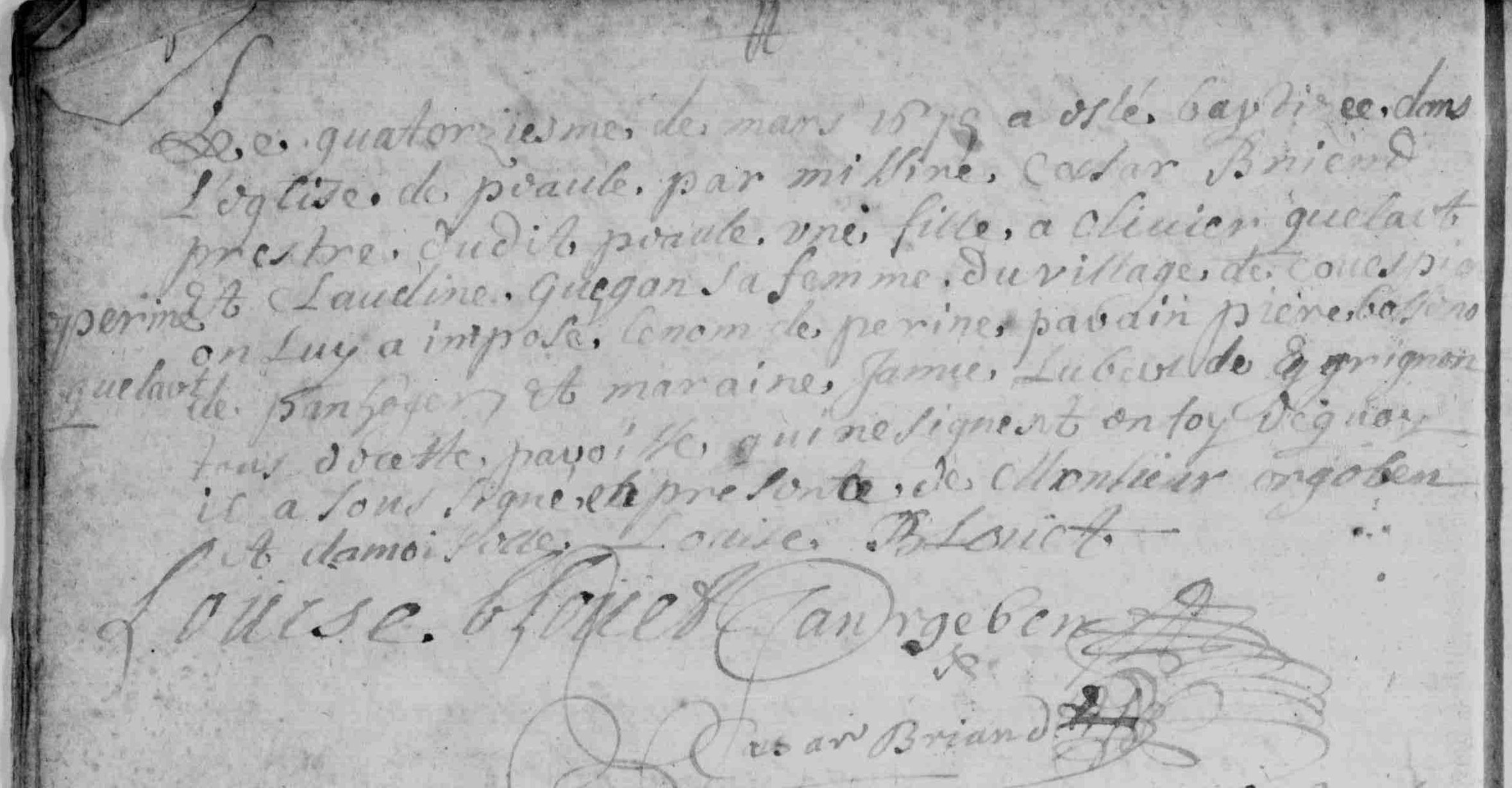 | Prénom | Perine | | Nom de famille | Quelart | | Naissance | 14 mars 1675 | Péaule, Morbihan, FRANCE (, Péaule, 56153, Morbihan, Bretagne, France) | | Baptême | 14 mars 1675 | Péaule, Morbihan, FRANCE (, Péaule, 56153, Morbihan, Bretagne, France) |
