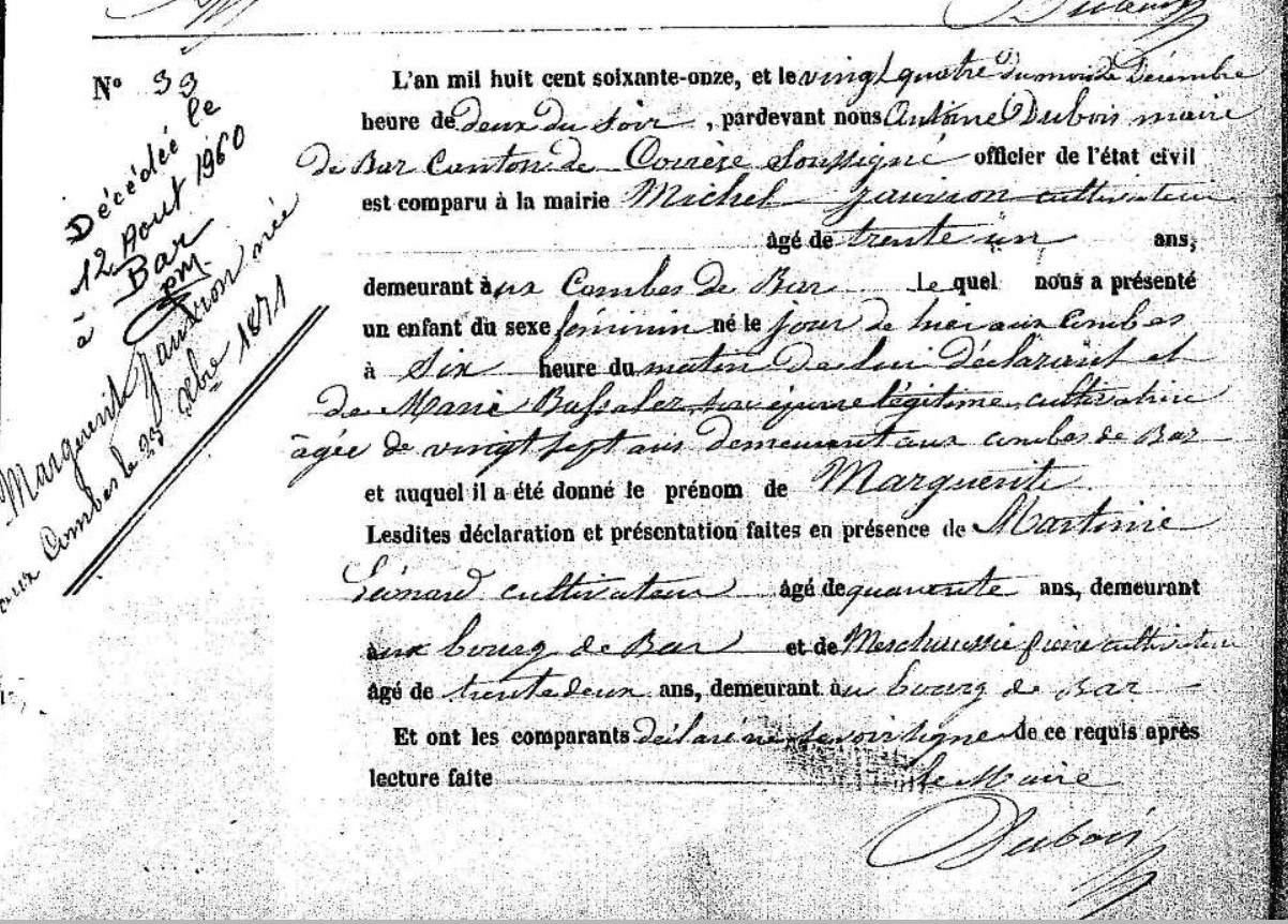 | Prénom | Marguerite | | Nom de famille | Jauvion | | Naissance | 23 décembre 1871 | Bar, Corrèze, FRANCE (, Bar, 19016, Corrèze, Nouvelle-Aquitaine, France) | Décès mentionné en marge de son acte de naissance | Décès (plus...) | 12 août 1960 à l'âge de 89 ans | Bar, Corrèze, FRANCE (, Bar, 19016, Corrèze, Nouvelle-Aquitaine, France) |