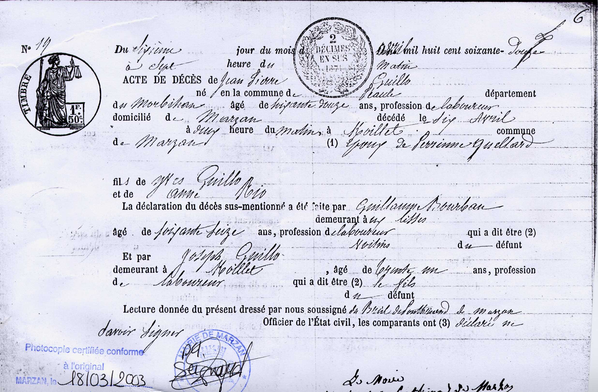| Hameau de Kervilet | Décès (plus...) | 6 avril 1872 à l'âge de 73 ans | Marzan, Morbihan, FRANCE (, Marzan, 56126, Morbihan, Bretagne, France) | Témoins Décès | Témoin Guillaume Bourban (1796) Témoin Joseph Marie Guillo (8 janvier 1840 - 1 mars 1902)