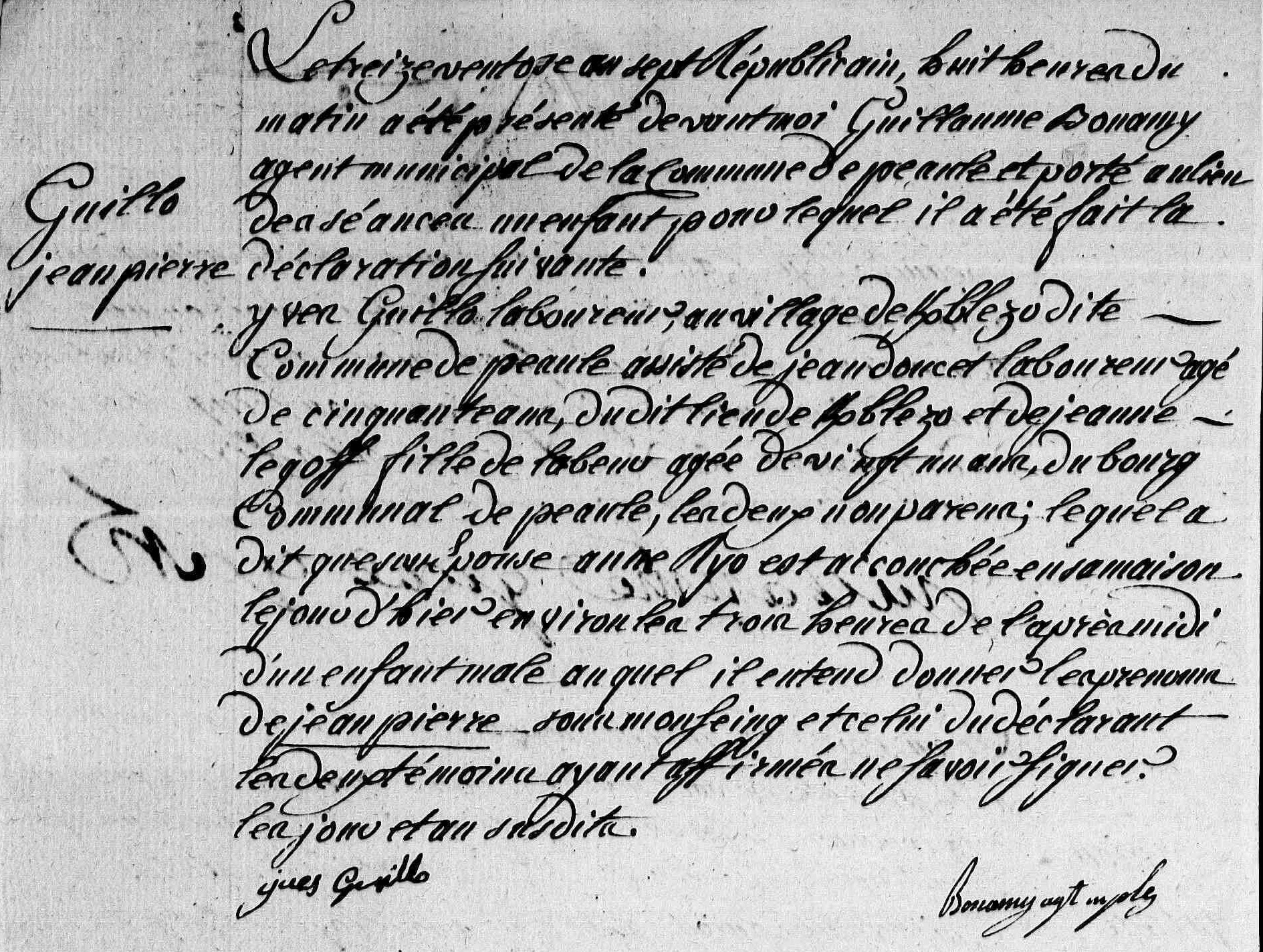 | Prénom | Jean Pierre | | Nom de famille | Guillo | | Profession | Laboureur | Le treize ventose an sept républicain, huit heures du matin a été présenté devant moi Guillaume Bonamy agent municipal de la commune de péaule et porté au lieu de...... un enfant pour lequel il a été fait la déclaration suivante. Yves Guillo laboureur au village de Koblezo dite commune de péaule assisté de jean doucet laboureur âgé de cinquante ans, dudit lieu de Koblezo et de jeanne legoff fille de labeur âgée de vingt un an,du bourg communal de péaule, les deux ..... lequel a dit que son épouse anne ryo est accouchée en sa maison d'un enfant male auquel il entend donner le prénom de jean pierre .... ... et celui du déclarant les deux témoins ayant affirmé ne savoir signer .. .... signature yves guillo, Bonamy agt ... | Naissance (plus...) | 2 mars 1799 | Péaule, Morbihan, FRANCE (, Péaule, 56153, Morbihan, Bretagne, France) | Témoins au Bapteme/Naissance | Père Yves Guillo 136 (7 septembre 1751 - 23 mars 1803) Témoin Jean Doucet (1749) Témoin Jeanne Legoff (1778)