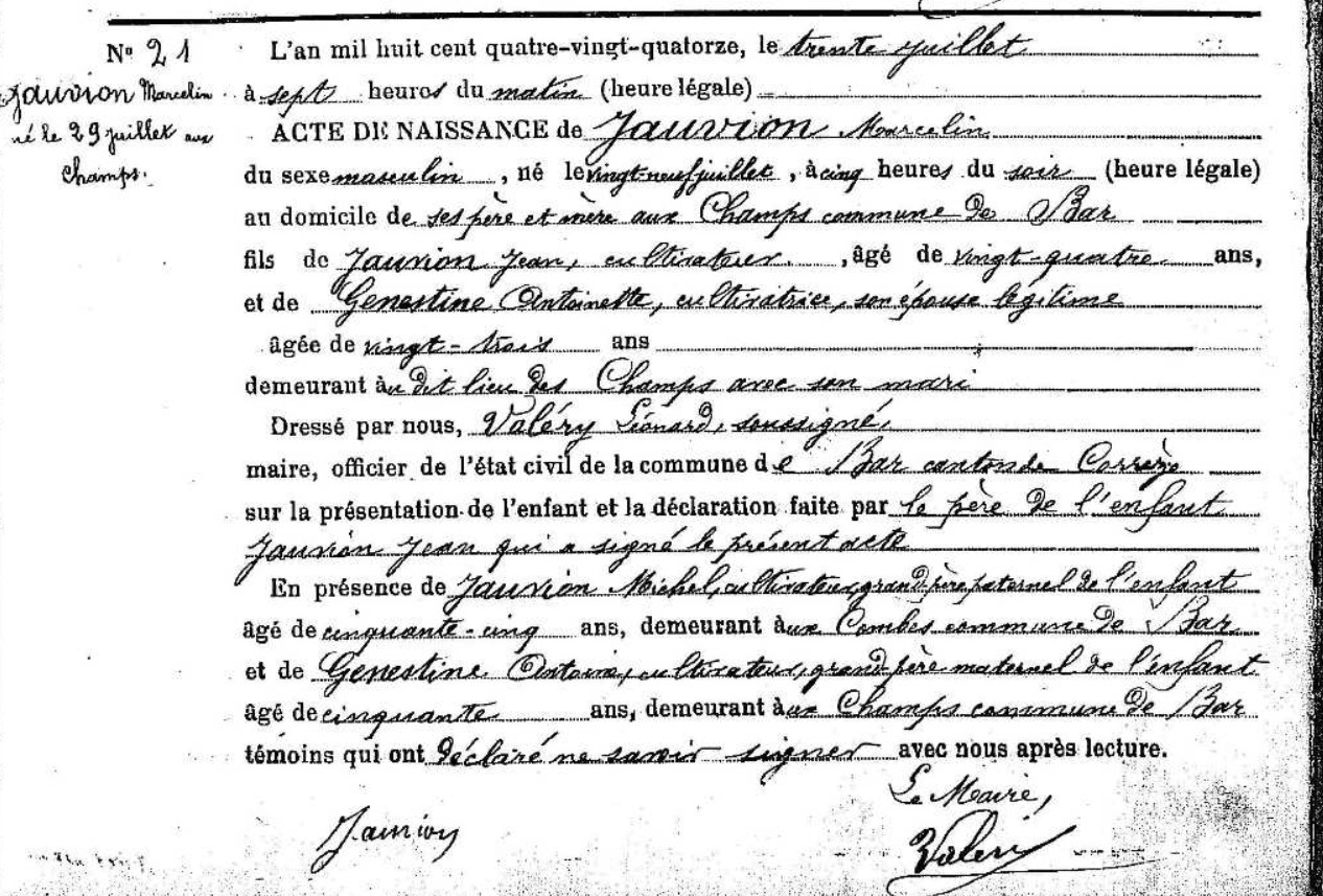 | Prénom | Marcelin | | Nom de famille | Jauvion | | Naissance | 29 juillet 1894 | Bar, Corrèze, FRANCE (, Bar, 19016, Corrèze, Nouvelle-Aquitaine, France) | Témoins au Bapteme/Naissance | Grand-père Michel Jauvion (9 septembre 1840) Grand-père Antoine Genestine (1844)