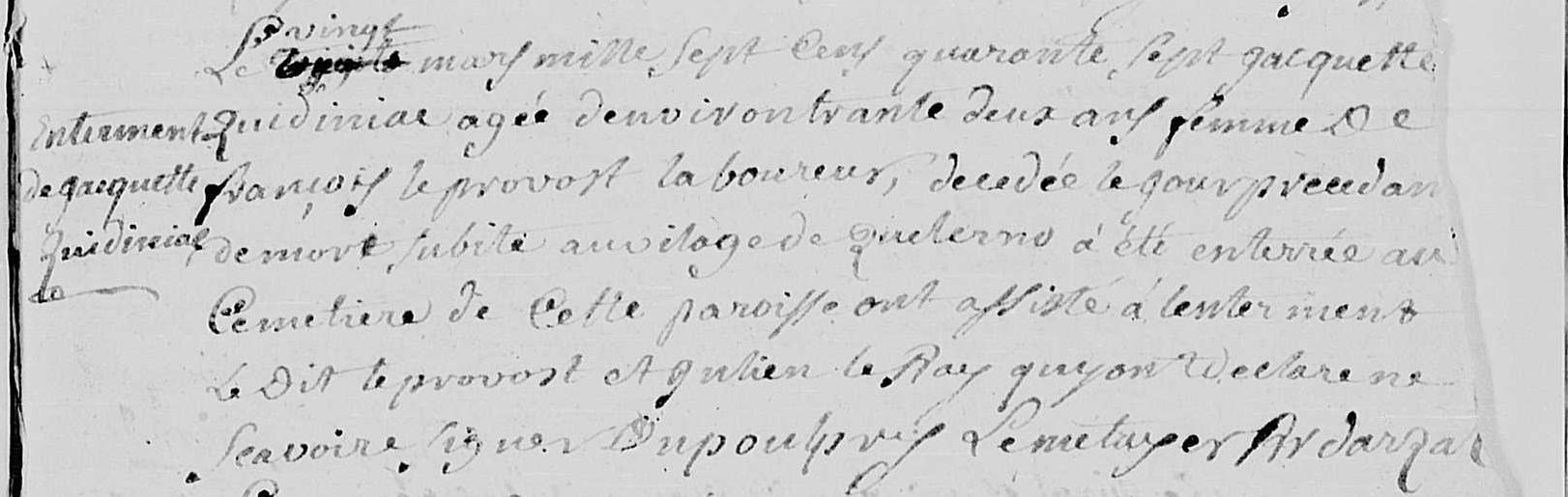 | | Décès | 19 mars 1747 à l'âge de 32 ans | Arzal, Morbihan, FRANCE (, Arzal, 56004, Morbihan, Bretagne, France) |