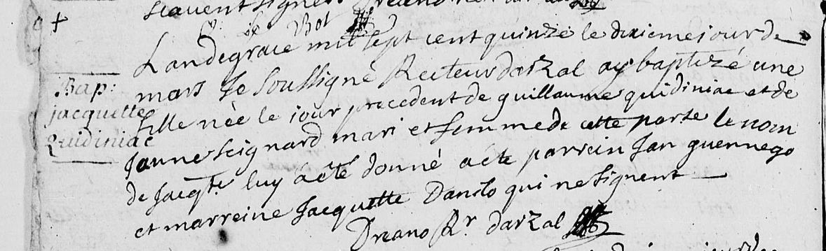 | Prénom | Jacquette | | Nom de famille | Quidinial | L'an de grace mil sept cent quinze le dixieme jour de mars je soussigné Recteur d'Arzal ay baptisé une fille née le jour précédent de Guillaume Quidiniac et de Jeanne Seignard mari et femme de ce paroisse le nom de Jacquette a été donné a été parrain Jan Gennego et Marraine Jacquette Danilo qui ne signent | Naissance (plus...) | 9 mars 1715 | Arzal, Morbihan, FRANCE (, Arzal, 56004, Morbihan, Bretagne, France) | | Baptême | 9 mars 1715 | Arzal, Morbihan, FRANCE (, Arzal, 56004, Morbihan, Bretagne, France) | Témoins au Bapteme/Naissance | Parrain Jan Guennego Marraine Jacquette Danilo