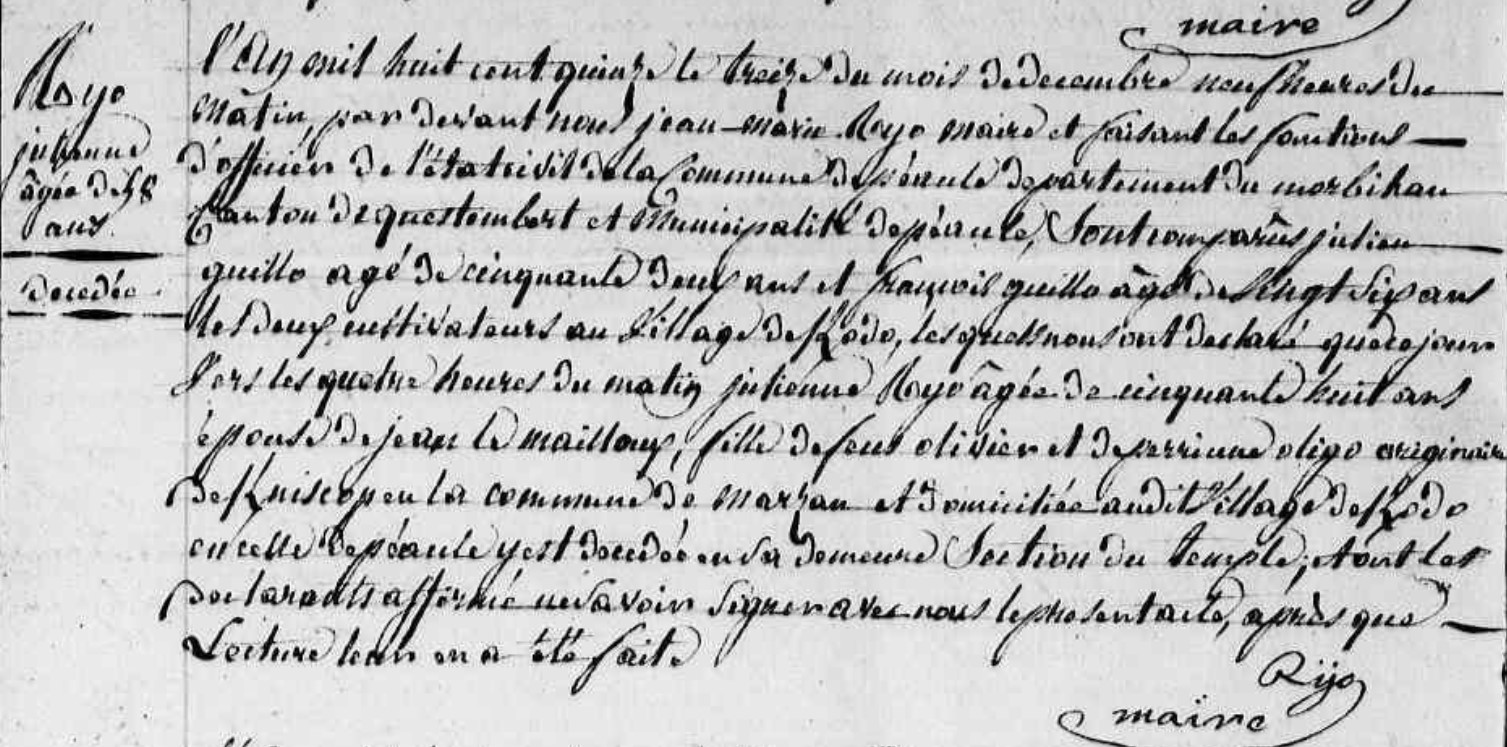 | Prénom | Julienne | | Nom de famille | Ryo | | Profession | Femme de labeur | l'an mil huit cent quinze le treize du mois de décembre neuf heures du matin, par devant nous Jean Marie Ryo maire et faisant les offices d'officier de l'état civil de la commune de Péaule département du Morbihan canton de Questembert et municipalité de Péaule sont comparus Julien Guillo agé de cinquante deux ans et François Guiloi agé de vingt six ans les deux cultivateurs au village de Kerodo, lesquels nous ont déclaré que ce jour vers les quatre heures du matin Julienne Ryo agée de cinquante huit ans épouse de Jean le Mailloux, fille de feu Olivier et de Perrine Oligo originaire de .... .... la commune de Marzan et domicilié audit village de Kerodo en cette de Péaule y est décédée en sa demeure, section? du temple, et ont les déclarants affirmé ne savoir signer avec nous le présent acte après que lecture leur en a été faite | Décès (plus...) | 13 décembre 1815 | Péaule, Morbihan, FRANCE (, Péaule, 56153, Morbihan, Bretagne, France) | | Sépulture | 13 décembre 1815 | Péaule, Morbihan, FRANCE (, Péaule, 56153, Morbihan, Bretagne, France) |