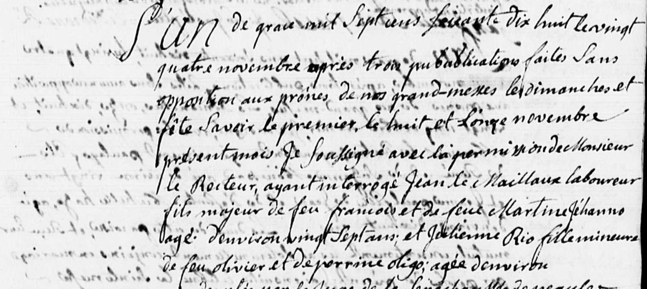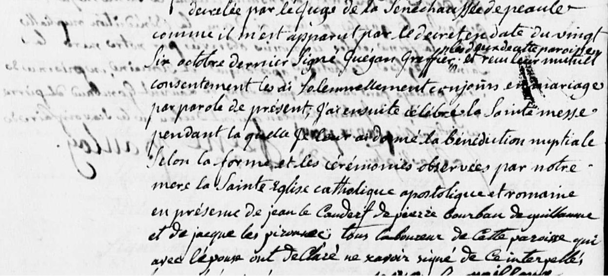 | Union | Jean Le Mailloux 278 (1753 - 7 avril 1831) | L'an de grace mil sept cent soixante dix huit le vingt quatre novembre apres trois publications faites sans opposition aux ... de nos grand messes les dimanches et fête Savoir le premier, le huit et l'onze novembre présent mois je soussigné avec la permission de monsieur le recteur ayant interrogé Jean le Mailloux laboureur fils majeur de feu françois et de feue Martine Jehanno agé d'environ vingt sept ans et Julienne Rio fille mineure de feu Olivier et de Perrine Oligo agée d'environ ... par le juge de la senechaussé de Peaule comme il m'est apparu par le decret en date du vingt six octobre dernier signé Guegan Greffier les deux de cette paroisse et recu leur mutuel consentement les ai solennellement conjoins en mariage par parole de présent; j'ai ensuite célébré la sainte messe pendant laquelle je leur ai donné la bénédiction nuptiale selon la forme et les cérémonies observées par notre mere la sainte église catholique apostolique et romaine en présence de Jean le Coudert de pierre Bourban de guillaume et de jacque le peronnec, tous laboureurs de cette paroisse qui avec l'epouse ont déclaré ne savoir signé de ce interpellé | Mariage (plus...) | 24 octobre 1778 | Marzan, Morbihan, FRANCE (, Marzan, 56126, Morbihan, Bretagne, France) | Enfant(s) | Jeanne Le Mailloux 139 (2 septembre 1779 - 18 octobre 1852)