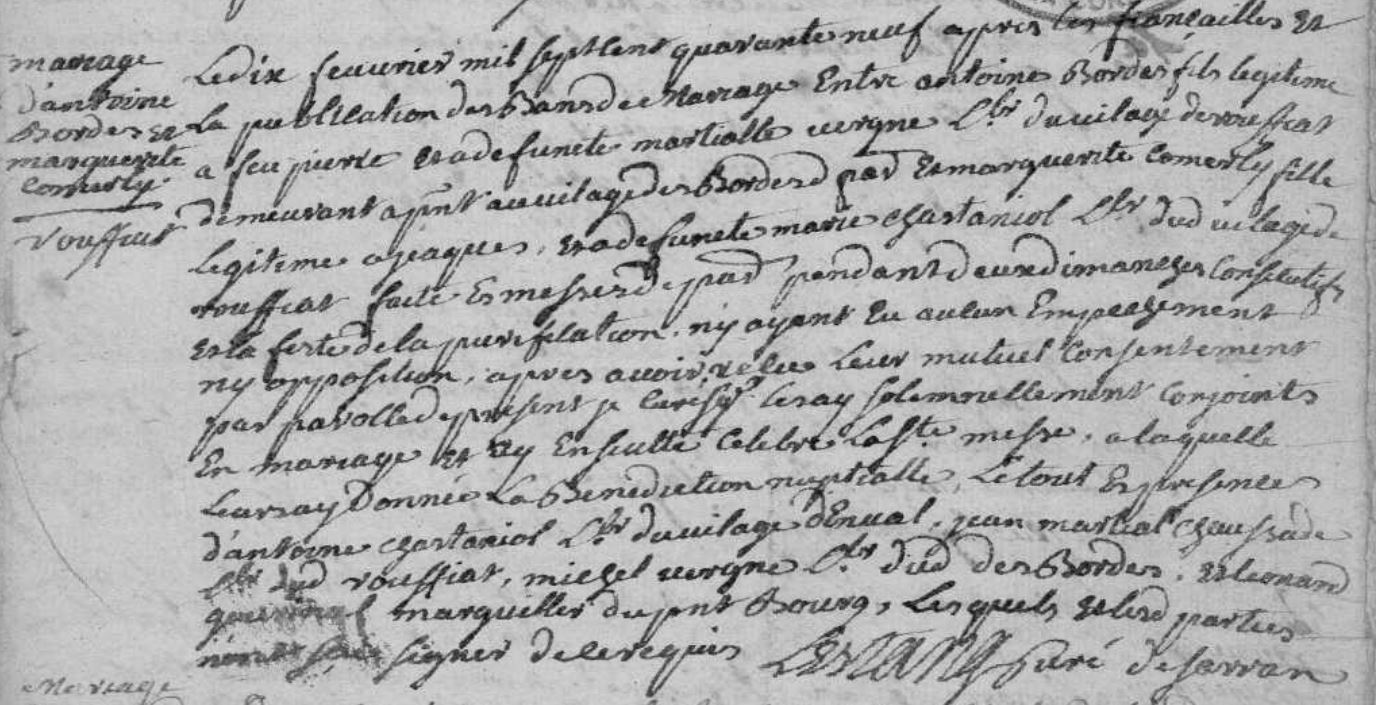 le dix février mil sept cent quarante neuf apres les fiancailles et la publication des bans du mariage entre antoine Bordes fils légitime à feu pierre et à défunte martialle vergne ... du village de rouffiat demeurant ... au village de Bordes... et marguerite Cormely fille légitime à jacques et defunte marie chastaniol .. dudit village de rouffiat ...