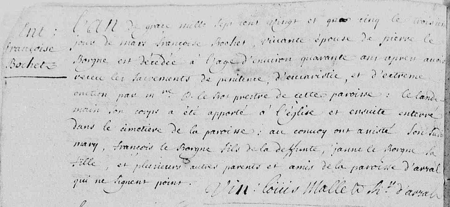 | | Décès | 3 mars 1725 à l'âge de 42 ans | Arzal, Morbihan, FRANCE (, Arzal, 56004, Morbihan, Bretagne, France) | Témoins Décès | Témoin François Le Borgne (1709) Témoin Jeanne Le Borgne (4 mars 1706)
