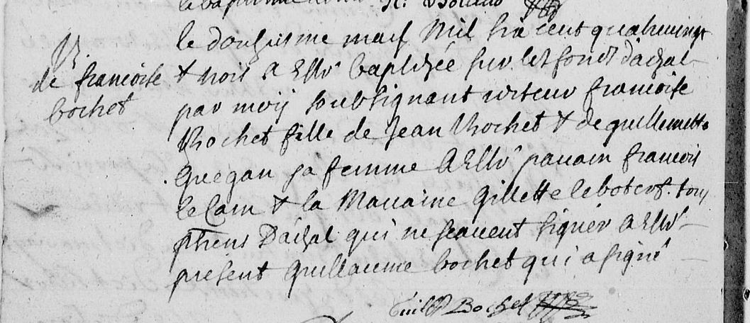 | Prénom | Françoise | | Nom de famille | Bochet | le douzieme mars mil six cent quatre vingt trois a été baptisée ... par moy ...Françoise Bochet fille de Jean Bochet et de Guillemette Guégan sa femme a été parrain François le Carn et la marraine Gilette Lebotero tous deux d'Arzal qui ne savent signer ... été présent Guillaume Bochet qui a signé | Naissance (plus...) | 12 mars 1683 | Arzal, Morbihan, FRANCE (, Arzal, 56004, Morbihan, Bretagne, France) | | Baptême | 12 mars 1683 | Arzal, Morbihan, FRANCE (, Arzal, 56004, Morbihan, Bretagne, France) | Témoins au Bapteme/Naissance | Parrain ? Marraine Gilette le Botero