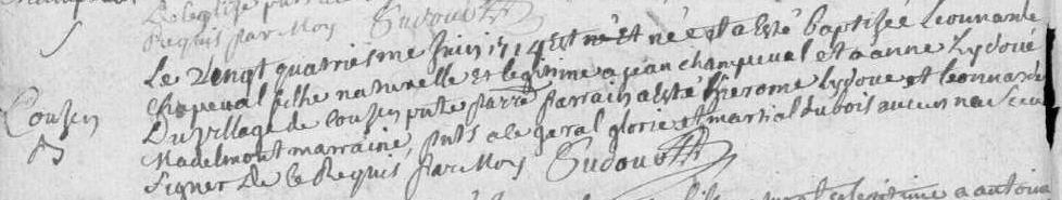 | Prénom | Léonarde | | Nom de famille | Champeval | | Naissance | 24 juin 1714 | Bar, Corrèze, FRANCE (Cousein, Bar, 19016, Corrèze, Nouvelle-Aquitaine, France) | | Baptême | 24 juin 1714 | Bar, Corrèze, FRANCE (, Bar, 19016, Corrèze, Nouvelle-Aquitaine, France) |
