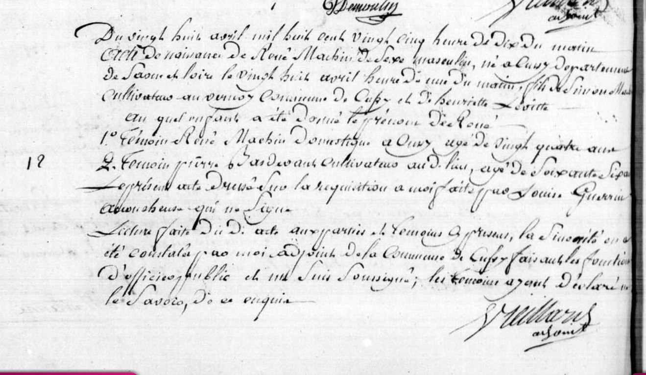 | Prénom | René | | Nom de famille | Machin | | Profession | Charpentier | du vingt huit avril mil huit cent vingt cinq heure de dix du matin. Acte de naissance de René machin du sexe masculin né à Cussy département de Saone et Loire le vingt huit avril heure d'une du matin, fils de simon machin cultivateur au vernoy commune de cusst et de henriette levitte au quel enfant a été donné le prénom de René 1° témoin René Machin domestique à cussy âgé de vingt quatre ans 2° témoin Pierre Bardevant cultivateur au dit lieu âgé de soixante six ans Le présent acte dressé sur la réquisition à moi faite par Louis Guerrin accoucheur que ne signe Lecture faite du dit acte aux parties et témoins .. présens, la sincérité en a été constatée par moi adjoint de la commune de Cussy faisant les fonctions d'officier public .. ... suis soussigné; mes témoins ayant déclaré ne le savoir de ce requis | Naissance (plus...) | 28 avril 1825 | Cussy-en-Morvan, Saône-et-Loire, FRANCE (, Cussy-en-Morvan, 71165, Saône et Loire, Bourgogne-Franche-Comté, France) | Témoins au Bapteme/Naissance | Père Simon Machin (22 décembre 1796 - après 1843) Mère Henriette Levitte (2 janvier 1799) Témoin Pierre Bardevant (1759)