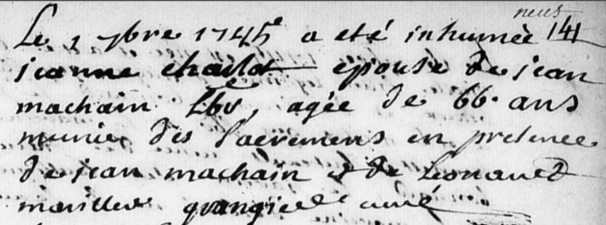 | Union | Jean Maschin 672 (17 avril 1683 - 4 août 1752) | Le quatorzieme jour du mois de février mil sept cent seize La publication des bans du mariage entre Jean Machin fils de Dominique Machin journalier à la Vallée et de Pierrette Jouan sa femme et Jeanne Charlot fille de M. Marin Charlot Sergent Royal au ... de dame Lazarre Digoy sa femme ... ayant été ... ... .... dimanche confirm... ... aucun empechement je soussigné pr... . ... à Cussy ayant ... ... Jean Machin et à Jeanne Charlot, .... mutuel consentement je leur ay ..... ... mariage ....dudit machin et pierrette Jouan ... et Jacques Machin son frère et du ... de la dite Charlot de M... Marin Charlot son pere et M.. Jacques Marcel... son oncle de Dominique Machin, de jean Jouan métayer .... ... ... ay donné la bénédiction nuptiale .. ... et ay signé ... Charlot et Mavilliers, les autres ... ayant dit ne le savoir | Mariage (plus...) | 4 février 1716 à l'âge de 36 ans | Cussy-en-Morvan, Saône-et-Loire, FRANCE (, Cussy-en-Morvan, 71165, Saône et Loire, Bourgogne-Franche-Comté, France) | Enfant(s) | Jacques Machin
