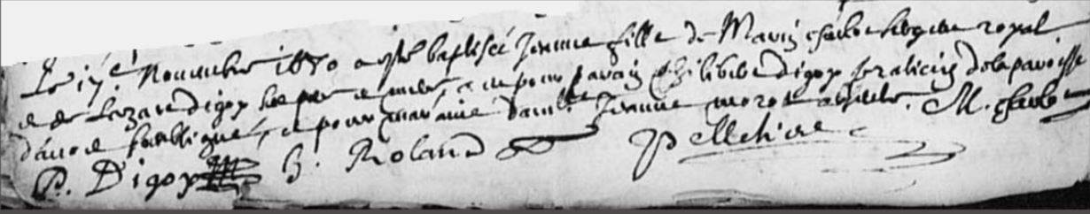 | Prénom | Jeanne | | Nom de famille | Charlot | | Profession | Laboureur à la Vallée | le 17 novembre 1680 a été baptisée Jeanne fille de marin charlot sergent royal et de lazarre digoy ses pere et mere, a eu pour parrain ... ... digoy praticien de la paroisse ... ... et pour marraine D.... Jeanne ... Signatures P. Digoy, B Roland, Pelletier | Naissance (plus...) | 17 novembre 1680 | Cussy-en-Morvan, Saône-et-Loire, FRANCE (, Cussy-en-Morvan, 71165, Saône et Loire, Bourgogne-Franche-Comté, France) | | Baptême | 17 novembre 1680 | Cussy-en-Morvan, Saône-et-Loire, FRANCE (, Cussy-en-Morvan, 71165, Saône et Loire, Bourgogne-Franche-Comté, France) | | Décès | 1 septembre 1745 à l'âge de 65 ans | Cussy-en-Morvan, Saône-et-Loire, FRANCE (, Cussy-en-Morvan, 71165, Saône et Loire, Bourgogne-Franche-Comté, France) | | Sépulture | 1 septembre 1745 | Cussy-en-Morvan, Saône-et-Loire, FRANCE (, Cussy-en-Morvan, 71165, Saône et Loire, Bourgogne-Franche-Comté, France) |
