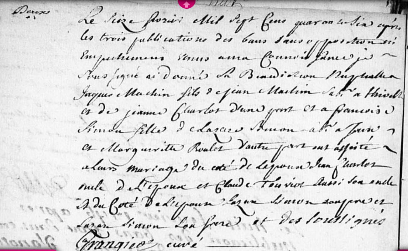 empechement .... a ma connaissance ... soussigné ai donné la bénediction nuptialle à Jacques Machin fils de Jean Machin laboureur à Thivelle et de Jeanne Charlot d'une part et à Françoise
