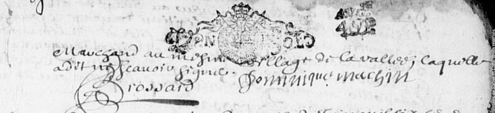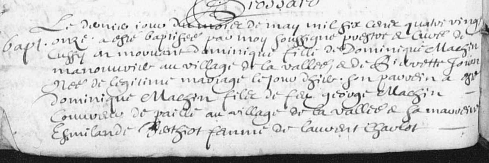 | Prénom | Dominique | | Nom de famille | Maschin | le dernier jour du mois de may mil six cent quatre vingt onze, a été baptisée par moi soussigné ... et curé de Cussy .. .... dominique fille de dominique machin manouvrier au village de la vallée et de Pierrette Jouan née de légitime mariage le jour d'hier. son parrain a été domique machin, fils de feu george machin, couvreur en paille au village de la vallée et la marraine emilande b... femme de laurent charlot | Naissance (plus...) | 29 mai 1691 | Cussy-en-Morvan, Saône-et-Loire, FRANCE (, Cussy-en-Morvan, 71165, Saône et Loire, Bourgogne-Franche-Comté, France) | | Baptême | 30 mai 1691 | Cussy-en-Morvan, Saône-et-Loire, FRANCE (, Cussy-en-Morvan, 71165, Saône et Loire, Bourgogne-Franche-Comté, France) | Témoins au Bapteme/Naissance | Machin Dominique Machin Marraine Emilande Brethiot