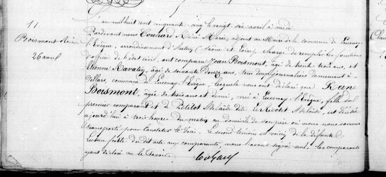 l'an mil huit cent cinquante-cinq le vingt-six avril à midi Pardevant nous Couhard René Marie, adjoint au maire de la commune de Lucenay-l'Evêque, arrondissement d'Autun, Saône-et-Loire, chargé de remplir les fonctions d'officier de l'état civil, ont comparu Jean Boismont, âgé de trente-trois ans et Etienne Ravatin, âgé de soixante-douze ans, tous deux journaliers demeurant à Villars, Commune de Lucenay-l-Evêque, lesquels nous ont déclaré que Reine Boismont, âgée de trois ans et demi, née à Lucenay-l'Evêque, fille du premier comparant et de Petitot Adélaïde dite Tricotet? Adélaïde, est décédée aujourd'hui à trois heures du matin au domicile de son père où nous nous sommes transporté pour constater le décès. le second témoin est voisin de la défunte.