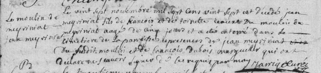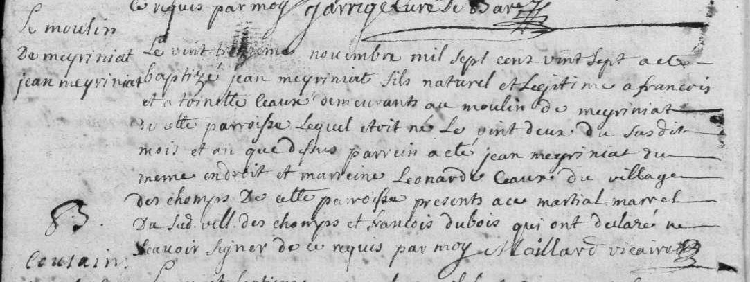 | Prénom | Jean | | Nom de famille | Meyriniat | le vingt troisieme novembre mil sept cens vingt sept a été baptisé jean meyriniat fils naturel et légitime à françois et à toinette ceaus demeurant au moulin de meyriniat en cette paroisse lequel etait né le vingt deux du susdit mois et ... parrain a été jean meyriniat du même endroit et marraine léonarde ceaux du village des champs de cette paroisse présents au.. martial marrel du sus... village des champs et françois dubois qui ont déclaré ne savoir signer de ce requis par moy. | Naissance (plus...) | 22 novembre 1727 | Bar, Corrèze, FRANCE (Moulin de meyriniac, Bar, 19016, Corrèze, Nouvelle-Aquitaine, France) | | Baptême | 22 novembre 1727 | Bar, Corrèze, FRANCE (, Bar, 19016, Corrèze, Nouvelle-Aquitaine, France) | | Décès | 22 novembre 1727 < 1 ans | Bar, Corrèze, FRANCE (Moulin de meyriniac, Bar, 19016, Corrèze, Nouvelle-Aquitaine, France) |