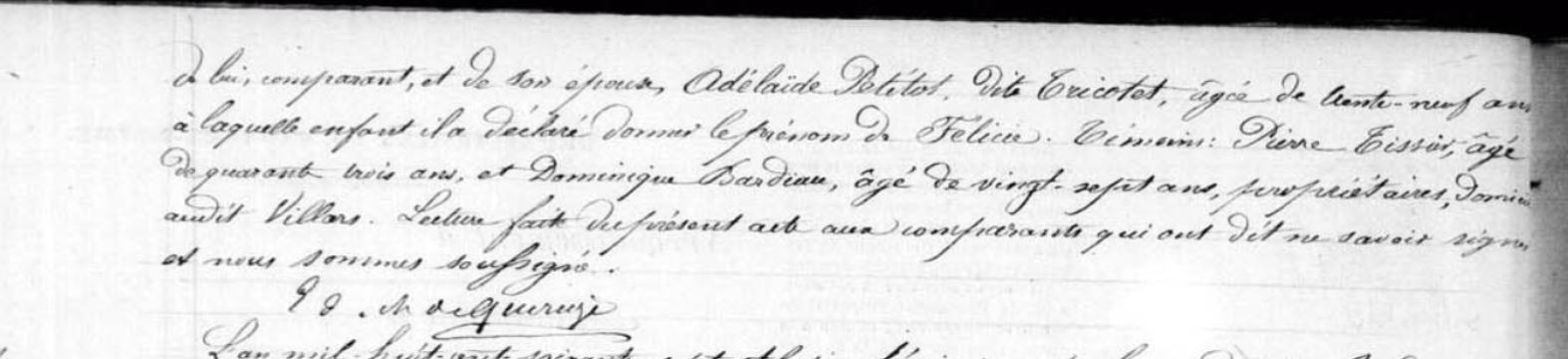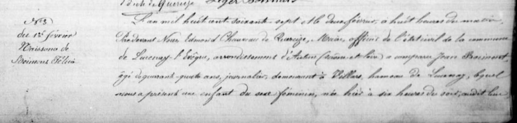 | Prénom | Félicie | | Nom de famille | Boismont | L'an mil huit cent soixante sept et le deux février à huit heures du matin pardevant nous Edmond Chauveau de Reureize, Maire, officier de l'état civil de la commune de Lucenay-l'Evêque arrondissement d'Autun (Saone et Loire) a comparu Jean Boimont agé de quarante quatre ans, journalier demeurant à Villars hameau de Lucenay lequel nous a présenté un enfant de sexe féminin née hier à six heures du soir ... de lui comparant et de son épouse Adelaïde Petitot dite Tricotet agée de trente neuf ans à laquelle enfant il a déclaré donner le prénom de Félicie. Pierre Tissier agé de quarante trois ans et Dominique Bardeau agé de vingt sept ans ... propriétaire domicilié audit Villars. Lecture fait du présent acte aux comparants qui ont dit ne savoir signer et nous sommes soussigné | Naissance (plus...) | 1 février 1867 | Lucenay-l'Évêque, Saône-et-Loire, FRANCE (Villars, Lucenay-l'Évêque, 71266, Saône et Loire, Bourgogne-Franche-Comté, France) | Témoins au Bapteme/Naissance | Père Jean Boismont 40 (1825 - 1938) Témoin Pierre Tissier (1824) Témoin Dominique Bardeau (1840)