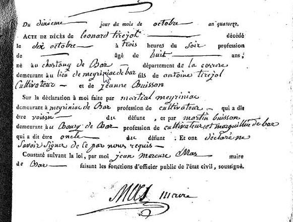 | Prénom | Léonard | | Nom de famille | Teregeol | | Naissance | 1798 | Bar, Corrèze, FRANCE (, Bar, 19016, Corrèze, Nouvelle-Aquitaine, France) | | Décès | 10 octobre 1806 à l'âge de 8 ans | Bar, Corrèze, FRANCE (, Bar, 19016, Corrèze, Nouvelle-Aquitaine, France) | Témoins Décès | Témoin Martial Meyriniac Témoin Martin Buisson