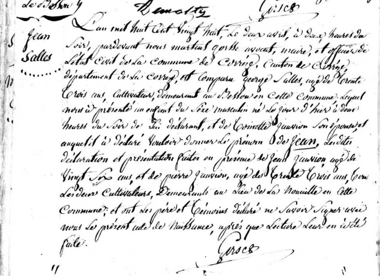 l'an mil huit cent vingt huit, le deux avril, à deux heures du soir, pardevant nous Martial Gorsse avocat maire et officier de l'état civil de la commune de Corrèze, canton de Corrèze, département de la Corrèze, est comparu Georges Salles, âgé de trente trois ans, cultivateur demeurant au Bessou en cette commune lequel nous a présenté un enfant du sexe masculin né le jour d'hier à deux heures du soir de lui déclarant, et de Toinette Jauvion son épouse et auquel il a déclaré vouloir donner le prénom de Jean, Lesdites déclaration et présentationfaites en présence de Jean Jauvion âgé de vingt six ans et de Pierre Jauvion âgé de trente trois ans tous les deux cultivateurs demeurant au lieu de la Nouaille en cette commune et ont les père et témoins déclaré ne savoir signer avec nous le présent acte de naissance, après que lecture leur en ait été faite