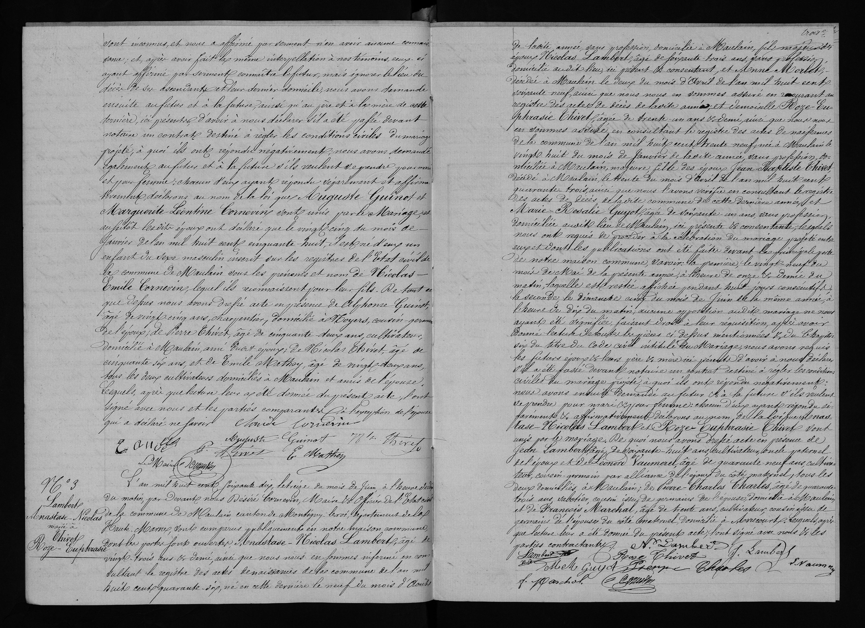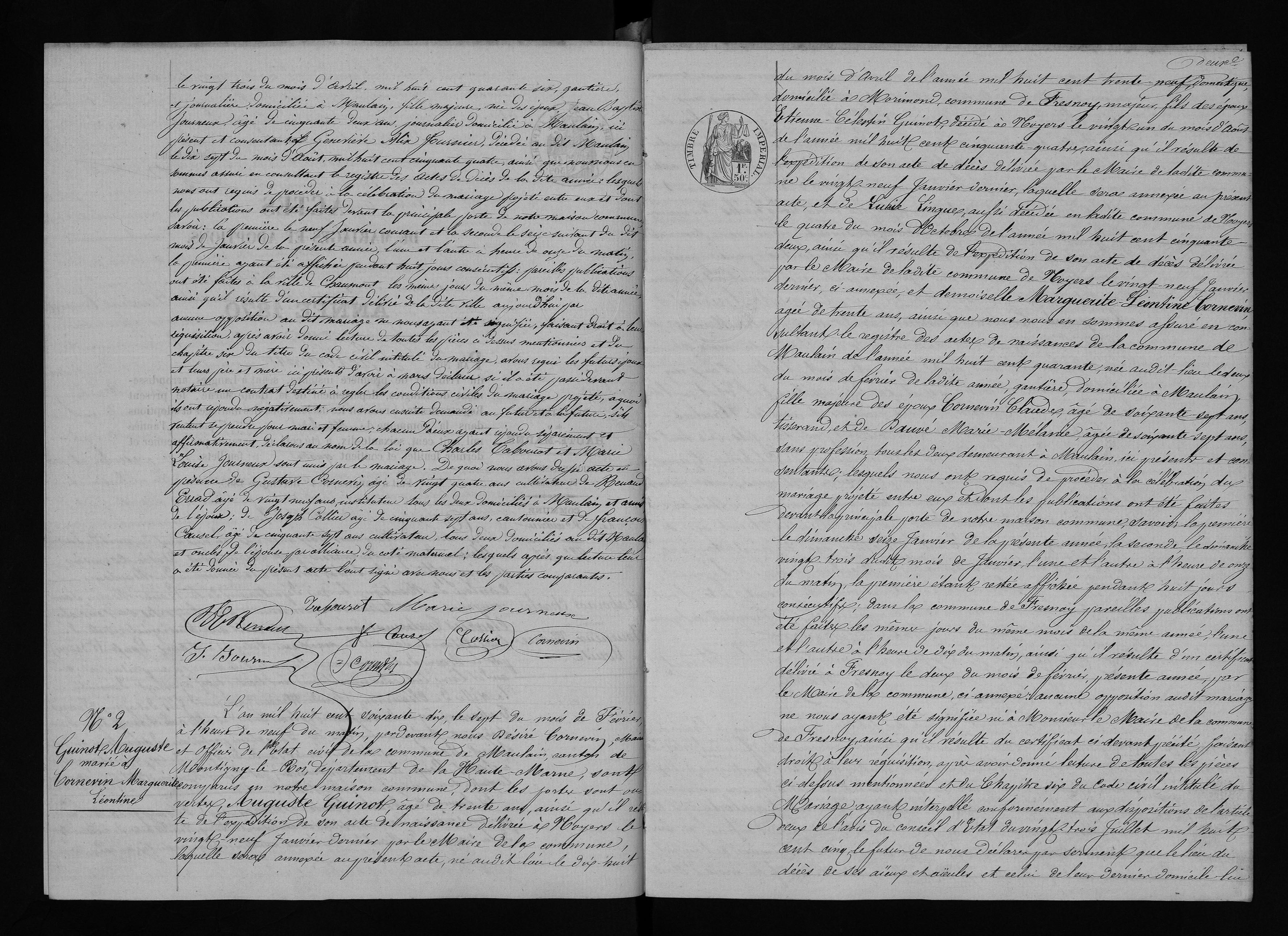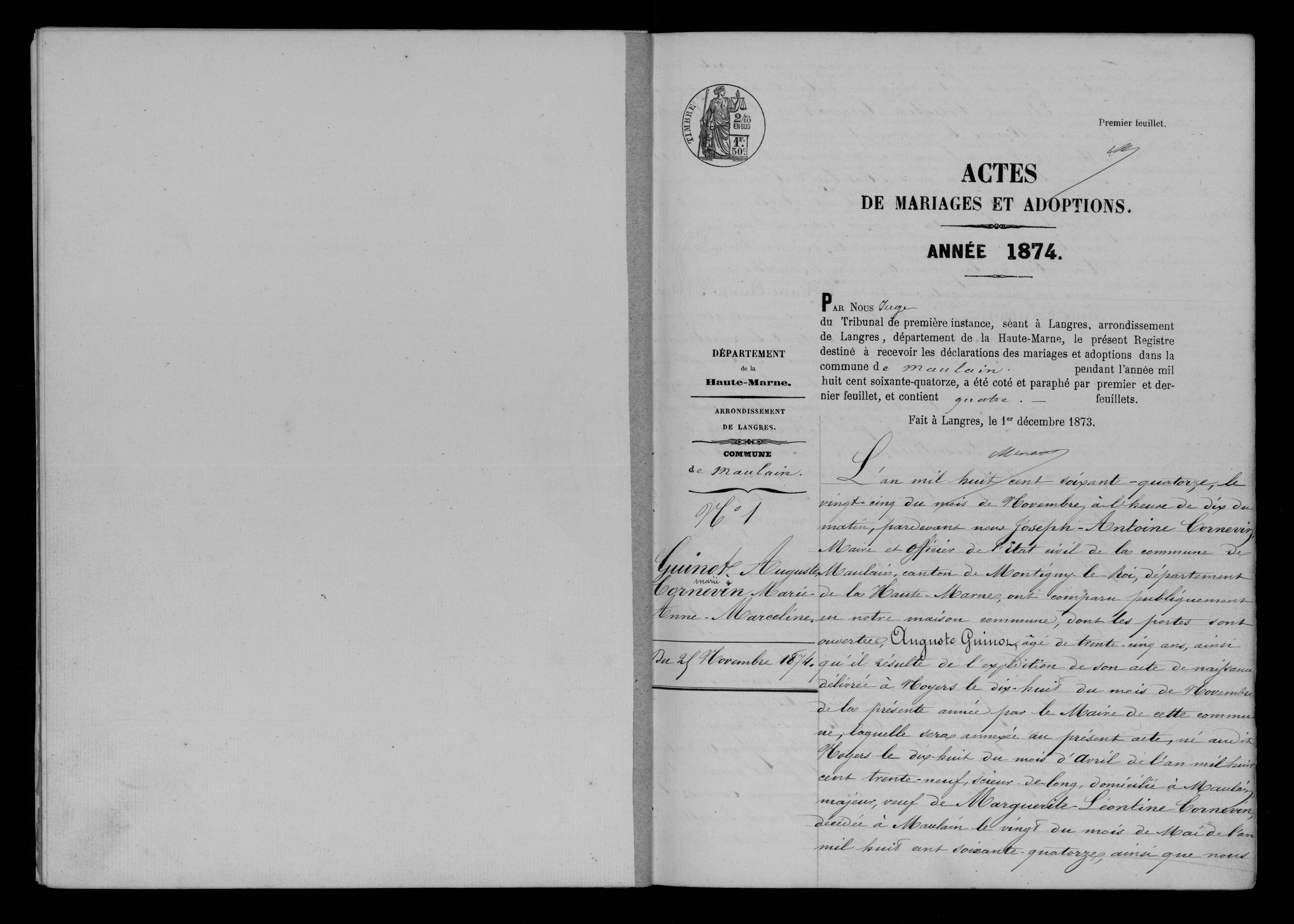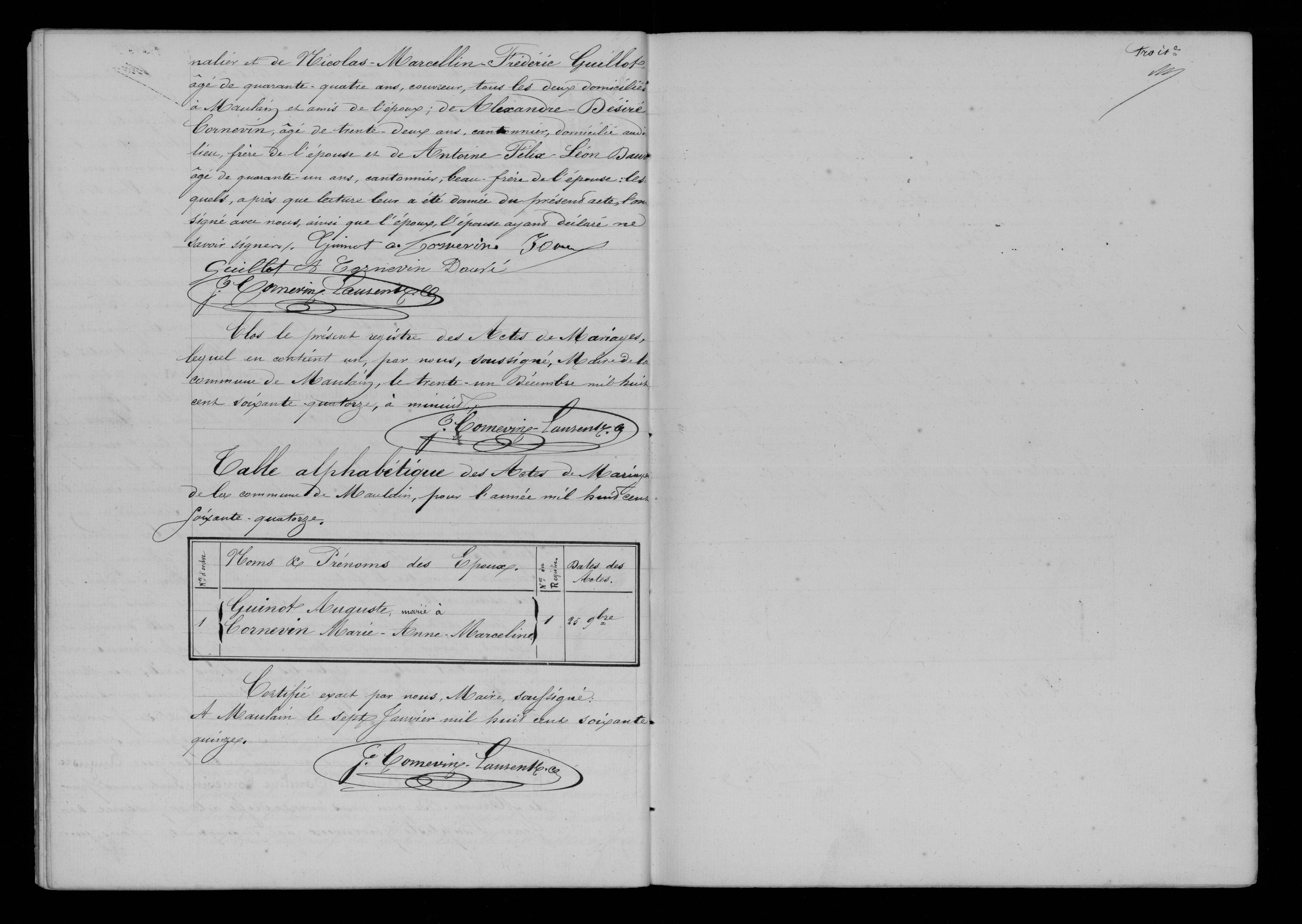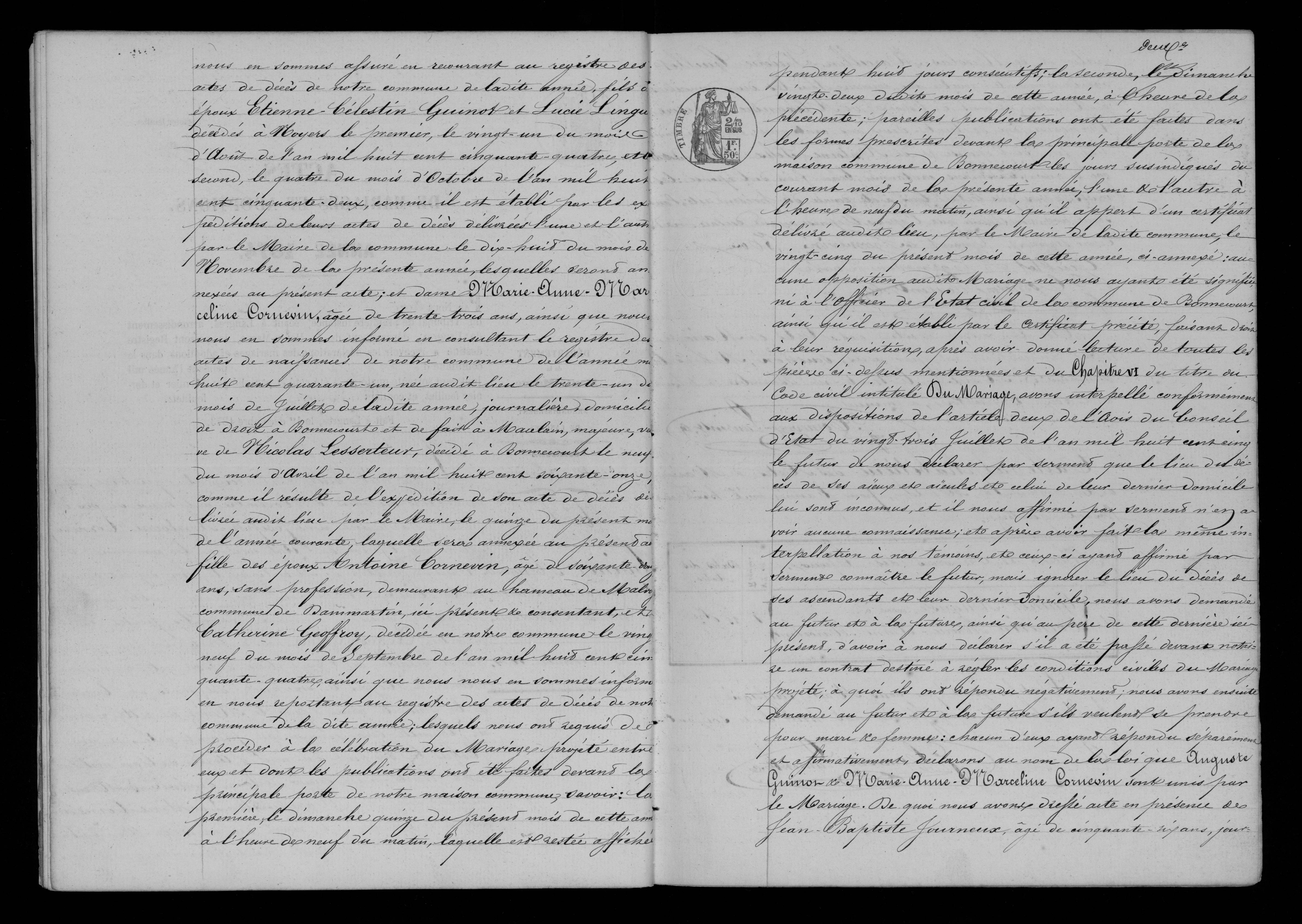 | Union | Marie Anne Marceline Cornevin (30 juillet 1841) | L'an mil huit cent soixante quatorze, le vingt cinq du mois de novembre à l'heure de dix du matin, pardevant nous Joseph Antoine Cornevin, Maire et officier de l'état civil de la commune de Maulain, canton de Montigny le Roi, département de la Haute-Marne, ont comparu pubiquement en notre maison commune, dont les portes sont ouvertes, Auguste Guinot, âgé de trente cinq ans, ainsi qu'il résulte de l'expédition de son acte de naissance délivré à Noyers le dix huit du mois de novembre de la présente année par le Maire de cette commu ne, laquelle sera annexée au présent acte, né audit Noyers le dix huit du mois d'avril de l'an mil huit cent trente neuf, scieur de long, domicilié à Maulain majeur, veuf de Marguerite Léontine Cornevin, décédée à Maulain le vingt du mois de Mai de l'an mil huit cent soixante quatorze, ainsi que nous nous en sommes assuré en recourant au registre des actes de décès de notre commmune de ladite année, fils à époux Etienne Celestin Guinot et Lucie Lingue décédés à Noyers le premier, le vingt-un du mois d'Août de l'an mil huit cent cinquante quatre, et second le quatre du mois d'octobre de l'an mil huit cent cinquante-deux, comme il est établi par les ex péditions de leurs actes de décès délivrée l'une et l'autre par le Maire de le commune le dix huit du mois de Novembre de la présente année lesquelles seront an nexées au présent acte; et dame Marie-Anne-Marce line Cornevin âgée de trente trois ans, ainsi que nous nous en sommes informé en consultant le registre des actes de naissance de notre commune de l'année mil huit cent quarante un, née audit lieu le trente-un du mois de juillet de ladite année, journalière, domiciliée de droit à Bonnecourts et de fait à Maulain, majeure, veuve de Nicolas Lesserteur, décédé à Bonnecourt le neuf du mois d'avril de l'an mil huit cent soixante-onze, comme il résulte de l'expédition de son acte de décès dé livrée audit lieu par le Maire, le quinze du présent mois de l'année courante laquelle sera annexée au présent ... fille des époux Antoine Cornevin, âgé de soixante ... ans, sans profession, demeurant au hameau de Mal.. commune de Dammartin, ici présent et consentant, et Catherine Geoffroy, décédée en notre commune, le vingt neuf du mois de Septembre de l'an mil huit cent cin quante quatre, ainsi que nous nous en sommes informé en nous reportant au registre des actes de décès de notre commune de la dite année, lesquels nous ont requis de procéder à la célébration du Mariage projeté entre eux et dont les publications ont été faites devant la principale porte de notre maison commune; savoir : le premier le dimanche quinze du présent mois de cette année à l'heure de neuf heure du matin, laquelle est restée affichée pendant huit jours consécutifs; la seconde, le dimanche vingt deux dudite mois de cette année à l'heure de la précédente; pareilles publications ont été faites dans les formes prescrites devant la principale porte de la maison commune de Bonnecourt les jours susindiqués du courant mois de la présente année, l'une et l'autre à l'heure de neuf du matin, ainsi qu'il appert d'un certificat délivré audit lieu, par le Maire de ladite commune, le vingt-cinq du présent mois de cette année, ci-annexé ; au cune opposition audit Mariage ne nous ayants été signifiée né à l'officier de l'Etat civil de la commune de Bonnecourt ainsi qu'il est établi par le certificat précité, faisant droit à leur réquisition, après avoir donné lecture de toutes les pièces ci-dessus mentionnées et du Chapitre VI du titre du Code civil intitulé Du Mariage, avons interpellé conformément aux dispositions de l'article deux de l'Avis du Conseil d'Etat du vingt trois juillet de l'an mil huit cent cinq le futur de nous déclarer par serment que le lieu du dé cès de ses aïeux et aïeules et celui de leur dernier domicile lui sont inconnus, et il nous a affirmé par serment n'en a voir aucune connaissance, et après avoir fait la même in terpellation à nos témoins, et ceux-ci ayant affirmé par serment connaître le futur, mais ignorer le lieu du décès de ses ascendants et leur dernier domicile, nous avons demandé au futur et à la future, ainsi qu'au père de cette dernière ici présent, d'avoir nous déclarer s'il a été passé devant notai re un contrat destiné à régler les conditions civiles du Mariage projeté; à quoi ils ont répondu négativement; nous avons ensuite demandé au futur et à la future s'ils veulent se prendre pour mari et femme : chacun d'eux ayant répondu séparement et affirmativement, déclarons au nom de la loi que Auguste Guinot et Marie-Anne-Marceline Cornevin sont unis par le Mariage, De quoi nous avons dressé acte en présence de Jean-Baptiste Journeux, âgé de cinquante six ans, jour nalier et de Nicolas-Marcellin-Frédéric Guillot âgé de quarante quatre ans, couvreur, tous les deux domiciliés à Maulain et amis de l'époux; de Alexandre-Désiré Cornevin, âgé de trente-deux ans, cantonnier, domicilié audit lieu, frère de l'épouse et de Antoine-Félix-Léon Dauvé âgé de quarante un ans, cantonnier, beau-frère de l'épouse ; les quels, après que lecture leur a été donnée du présent acte, l'ont signé avec nous, ainsi que l'époux, l'épouse ayant déclaré ne savoir signer. | Mariage (plus...) | 25 novembre 1874 à l'âge de 35 ans | Val-de-Meuse, Haute-Marne, FRANCE (, Maulain, 52332, Haute Marne, Grand-Est, France) | Témoins au Mariage | Frère Alexandre Désisré Cornevin (1842) Beau-frère Antoine Felix Léon Dauvé (8 février 1834)
