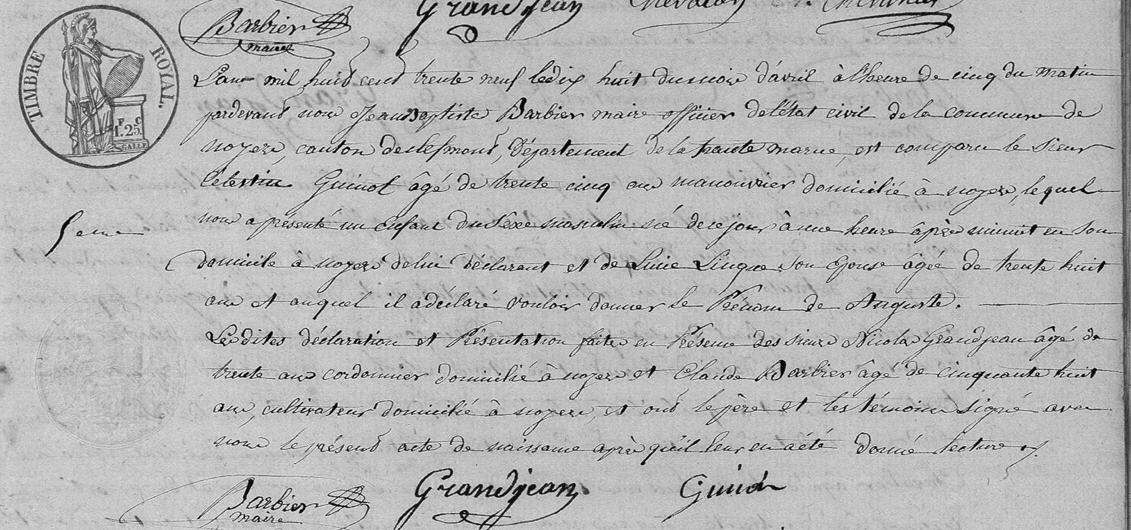 | Prénom | Auguste | | Nom de famille | Guinot | | Profession | Manouvrier | L'an mil huit cent trente neuf le dix huit du mois d'avril à l'heure de cinq du matin pardevant moi Jean Baptiste Barbier maire officier de l'état civil de la commune de Noyers, canton de..., département de Haute-Marne est comparu le sieur Celestin Guinot âgé de trente cinq ans manouvrier domicilé à Noyers, lequel nous a présenté un enfant du sexe masculin né de ce jour à une heure après minuit ce jour en son domicile à Noyers de lui déclarant et de Lucie Linges sion épouse âgée de trente huit ans et auquel il a déclaré vouloir donner le prénom de Auguste Les dites déclaration et présentation faite en présence des sieurs Nicolas Grandjean âgé de trente ans cordonnier domicilié à Noyers et Claude Barbier âgé de cinquante huit ans cultivateur domicilié à Noyers, et ont le père et les témoins signés avec nous le présent acte de naissance après qu'il leur en a été donné lecture | Naissance (plus...) | 18 avril 1839 | Noyers, Haute-Marne, FRANCE (, Noyers, 52358, Haute Marne, Grand-Est, France) | Témoins au Bapteme/Naissance | Témoin Nicolas Grandjean (1809) Témoin Claude Barbier