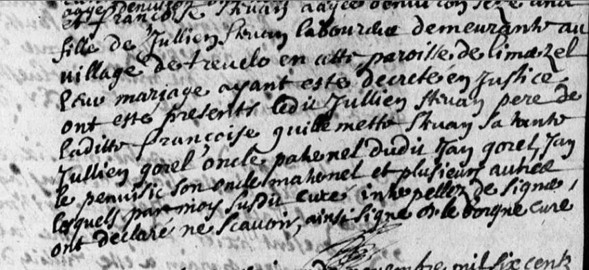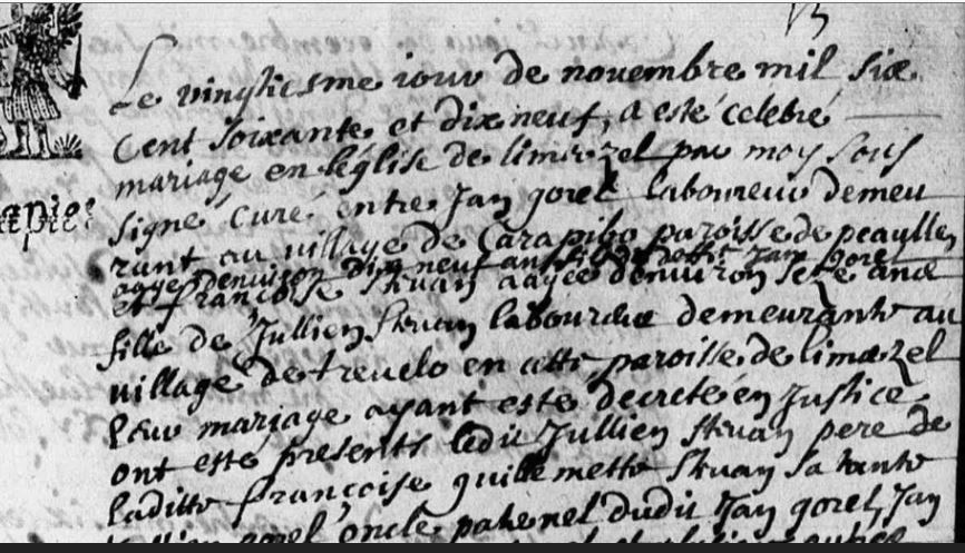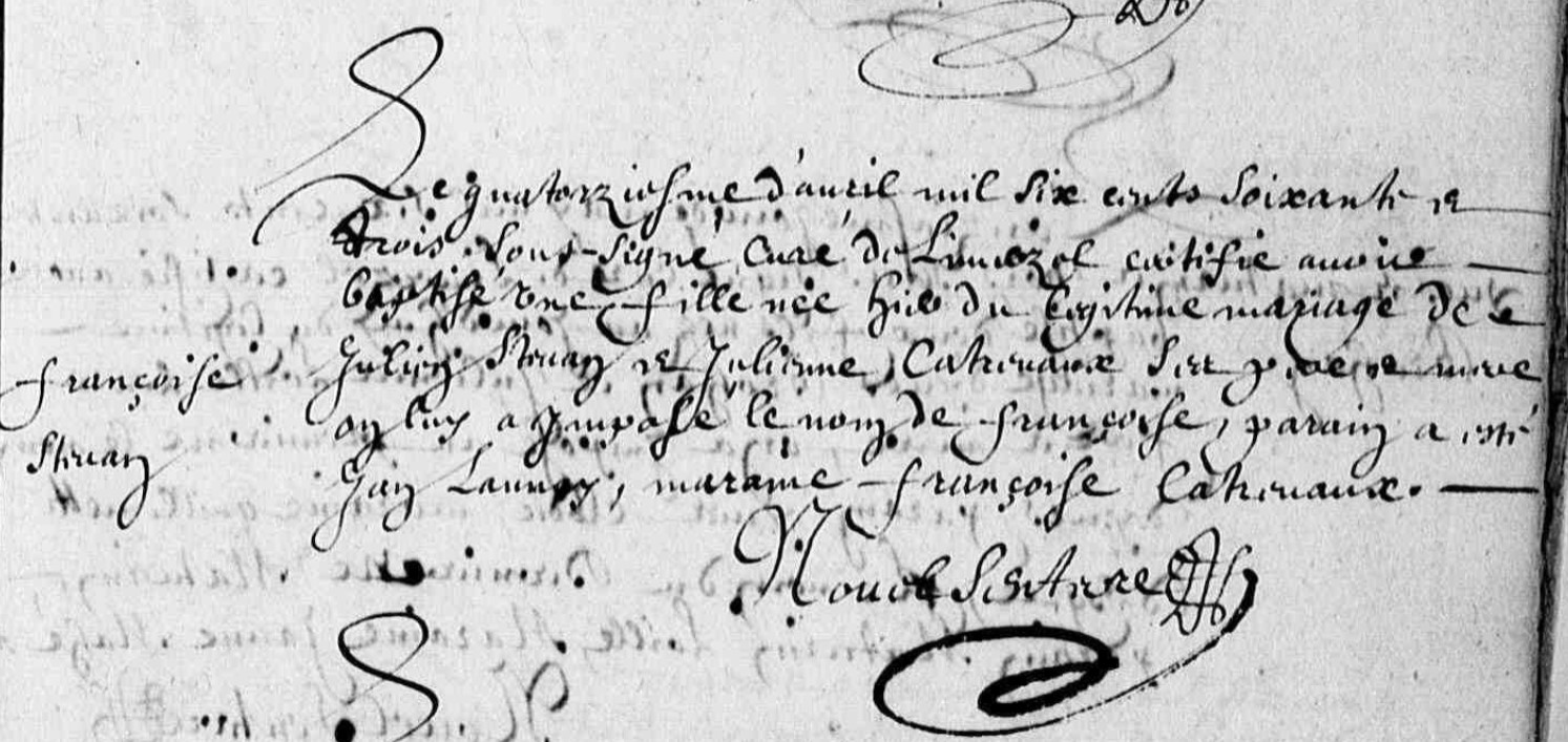 | Prénom | Françoise | | Nom de famille | Stevant | le quatorzieme d'avil mil sox cent soixante et trois sous signé curé de Limerzel certifie avoir baptisé une fille née hier du légitime mariage de Julien Stevan et Julienne Catrevaux ... .... ay luy a .... le nom de Françoise, parain a été Jan Launoy, maraine Françoise Catrevaux | Naissance (plus...) | 13 avril 1663 | Limerzel, Morbihan, FRANCE (, Limerzel, 56220, Morbihan, Bretagne, France) | | Baptême | 14 avril 1663 | Limerzel, Morbihan, FRANCE (, Limerzel, 56220, Morbihan, Bretagne, France) | | Décès | 2 janvier 1702 à l'âge de 39 ans | Péaule, Morbihan, FRANCE (, Péaule, 56153, Morbihan, Bretagne, France) | | Sépulture | 2 janvier 1702 | Péaule, Morbihan, FRANCE (, Péaule, 56153, Morbihan, Bretagne, France) |