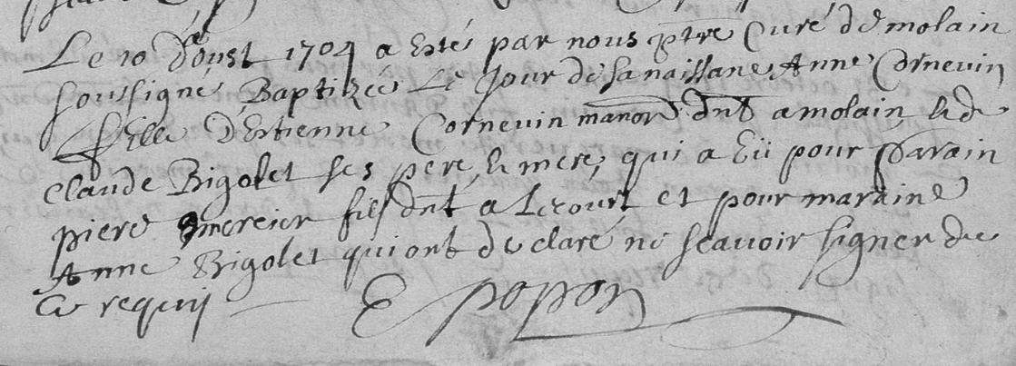 | Prénom | Anne | | Nom de famille | Cornevin | le 10 d'aout 1704 a été par ... curé de molain soussigné baptisée le jour de sa naissance Anne Cornevin fille d'Estienne Cornevin man? dud? molain et de Claude Bigolet ses père et mère qui a eu pour parrain pierre... fils.... et pour marraine Anne Bigolet qui ont déclaré ne savoir signer de ce requis | Naissance (plus...) | 10 août 1704 | Val-de-Meuse, Haute-Marne, FRANCE (, Maulain, 52332, Haute Marne, Grand-Est, France) | | Baptême | 10 août 1704 | Val-de-Meuse, Haute-Marne, FRANCE (, Maulain, 52332, Haute Marne, Grand-Est, France) |