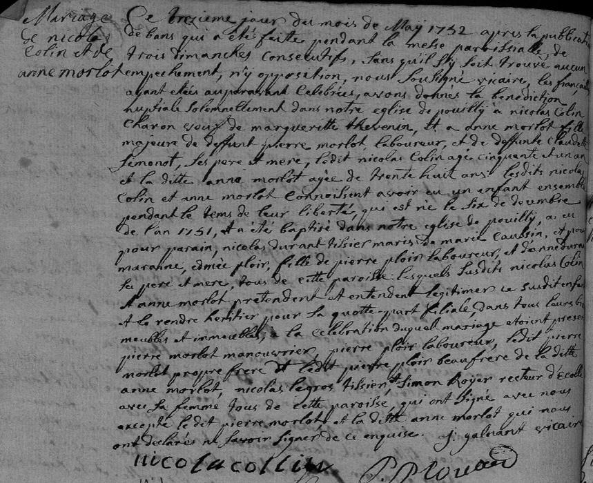 | Union | Anne Morlot 597 (26 décembre 1713) | Le treizieme jour du mois de May 1752 après la publication des bans qui a été faite pendant la messe paroissiale de trois dimanches consecutifs, sans qu'il s'y soit trouvé aucun empechement n'y opposition nous soussigné vicaire les fiancailles ayant été auparavant celebrées avons donné la bénédiction nuptialle solennelement dans notre église de Pouilly à Nicolas Colin charon veuf de marguerite Thevenin et à Anne Morlot fille majeure de défunt pierre morlot laboureur et de deffunte claudette simonot, ses pere et mere, ledit nicolas colin agé cinquante et un an et la ditte anne morlot agée de trente huit ans lesdit nicolas colin et anne Morlot connaissent avoir eu un enfant ensemble pendant le temps de leur liberté qui est né le six de décembre de l'an 1751 et a été baptisé dans notre église de Pouilly et a eu pour parrain nicolas durant ... maris de marie caulain et pour marraine edmée ploir fille de pierre ploir laboureur et d'anne durand ses pere et mere, tous de cette paroisse lesquels susdits nicolas colin et anne morlot prétendent et entendent légitimer ce susdit enfant et le rendre héritier pour la quotte part filiale dans tous leurs biens, meubles et immeubles, à la célébration duquel mariage était présent pierre morlot manouvrier, pierre ploir laboureur ledit pierre morlot propre frere et ledit pierre ploir beau frere de la ditte anne morlot, nicolas legros ... et simon Royer recteur d'école avec sa femme tous de cette paroisse qui ont signé avec nous excepté le dit pierre morlot et la ditte anne morlot qui nous ont déclaré ne savoir signer de ce requis | Mariage (plus...) | 13 mai 1752 à l'âge de 51 ans | Châtelet-sur-Meuse (Le), Haute-Marne, FRANCE (, Pouilly en Bassigny, 52400, Haute Marne, Grand-Est, France) | Enfant(s) | Nicolas Collin 298