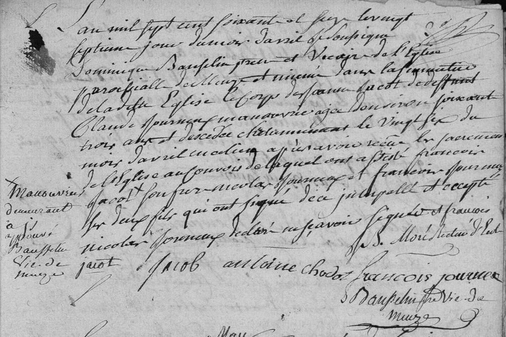 | Prénom | Jeanne | | Nom de famille | Jacob | L'an mil sept cent soixante seize le vingt septieme jour du mois d'avril je soussigné dominique Bauselin pretre et vicaire de l'église paroissialle de Meuse et ... de cette église le corps de Jeanne Jacot de defunt Claude Journeux manouvrier agée d'environ soixante trois ans et decédée chrétiennement le vingt six du mois d'avril en ....après avoir recue les sacrements de l'église ... à laquel ont assisté François Jacot son frère, Nicolas Journeux et François Journeux ses deux fils qui ont signé de ce .... et accepté, nicolas Journeux declaré ne savoir signé et françois jacot. | Décès (plus...) | 26 avril 1776 | Val-de-Meuse, Haute-Marne, FRANCE (, Val-de-Meuse, 52332, Haute Marne, Grand-Est, France) | Témoins Décès | Témoin François Jacot Témoin Nicolas Journeux (6 avril 1750) Témoin François Journeux (29 octobre 1751)
