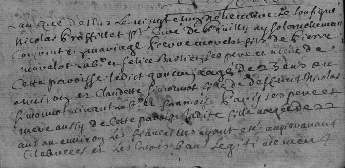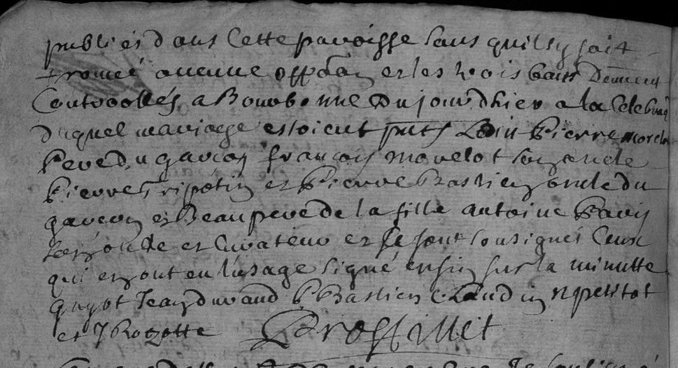 L'an que dessus le ving cinq novembre je soussigné nicolas Proffillet .. curé de Pouilly ay solennelement conjointe mariage Pierre Morelot fils de Pierre Morelot laboureur et felice Bastien ses pere et mere de cette paroisse ledict garcon agé de 23 ans ou environ et Claudette Simonnot fille de defunt Nicolas Simonno vivant laboureur et françoise Cavy ses pere et mere aussi de cette paroisse agée de 22 ans ou environ les fiancailles ayant été auparavant celebrées et les ... légitiment publiés dans cette paroisse sans qu'il y soit trouvé aucune opposition et les trois bans ... du jour d'hier à la célébration duquel mariage éstaient .. Pierre Morelot pere du garcon francois morelot son oncle Pierre rippotin et Pierre Bastien oncle du garcon et beau frere de la fille antoine Pavy .. et Curateur et ce jour soussigné ceux qui en ont eu l'usage signé ... que ..