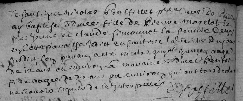 Je soussigné nicolas Prasfittes .. ay baptisé Edmée fille de Pierre Morelot le plus jeune et claude Simmonot sa femme demeurant en cette paroisse ... enfant née ... du jour susdit son parrain a été nicolas Guyot agé de 12 ans environs la marraine a été ... Petitot fille agée de dix ans environ qui on tous déclaré ne savoir signer de ce interpellé