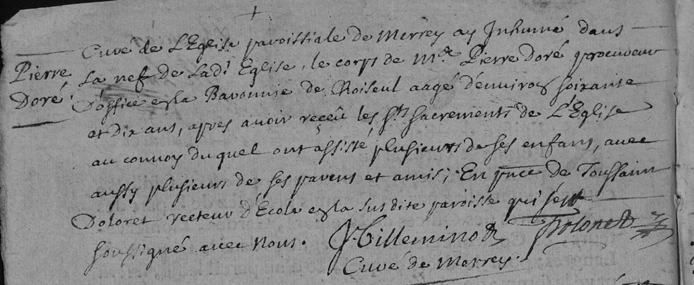 | Prénom | Pierre | | Nom de famille | Dore | | Profession | Procureur d'office | | Naissance | 1641 | | Agé de 70 ans à son décés | Décès (plus...) | 15 janvier 1711 à l'âge de 70 ans | Merrey, Haute-Marne, FRANCE (, Merrey, 52320, Haute Marne, Grand-Est, France) | | Sépulture | 15 janvier 1711 | Merrey, Haute-Marne, FRANCE (, Merrey, 52320, Haute Marne, Grand-Est, France) |